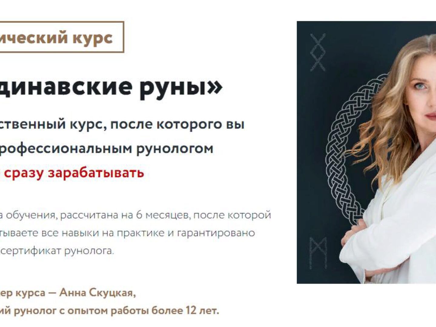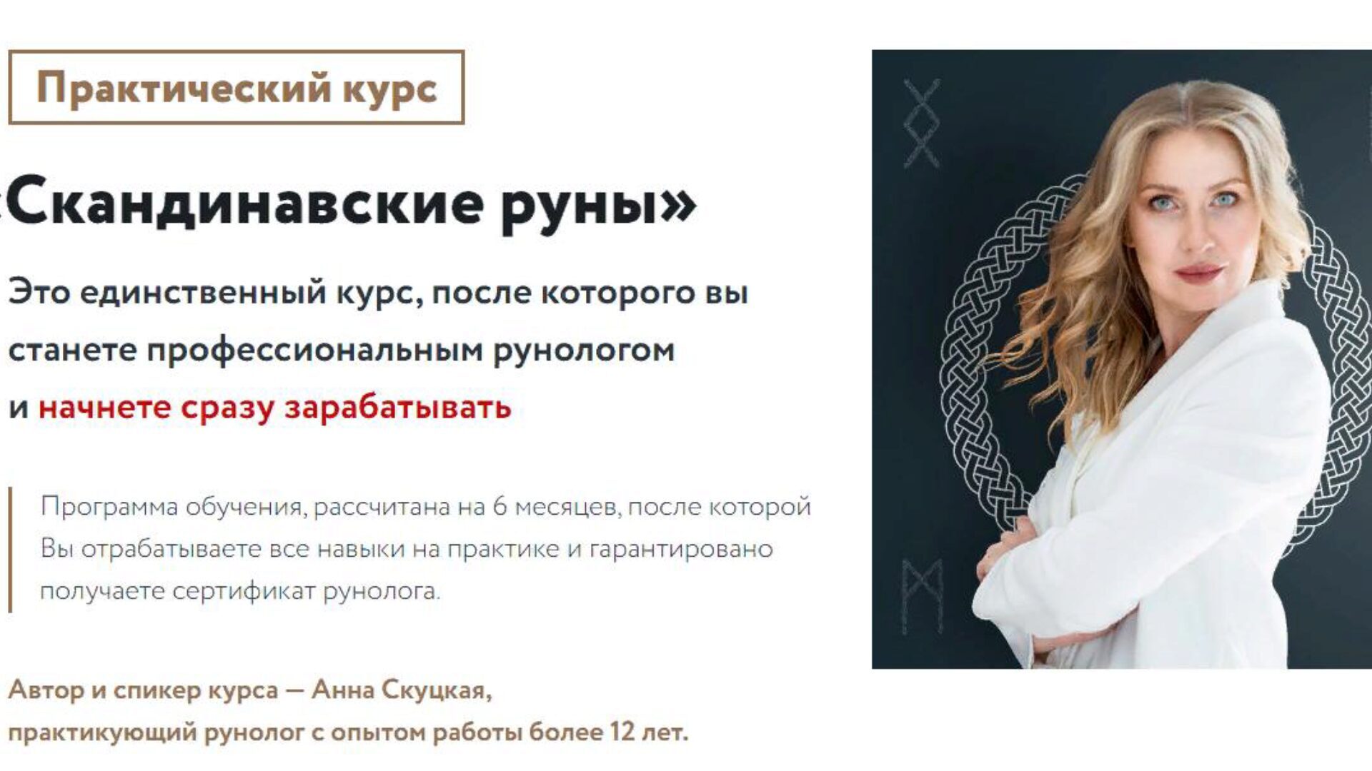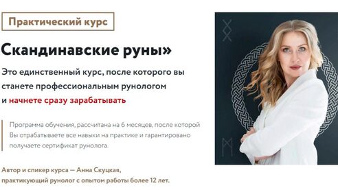 - После курса получите сертификат рунолога, вы начнете зарабатывать на своих знаниях от 100 000 рублей в месяц и попадете в реестр Анны Скуцкой.