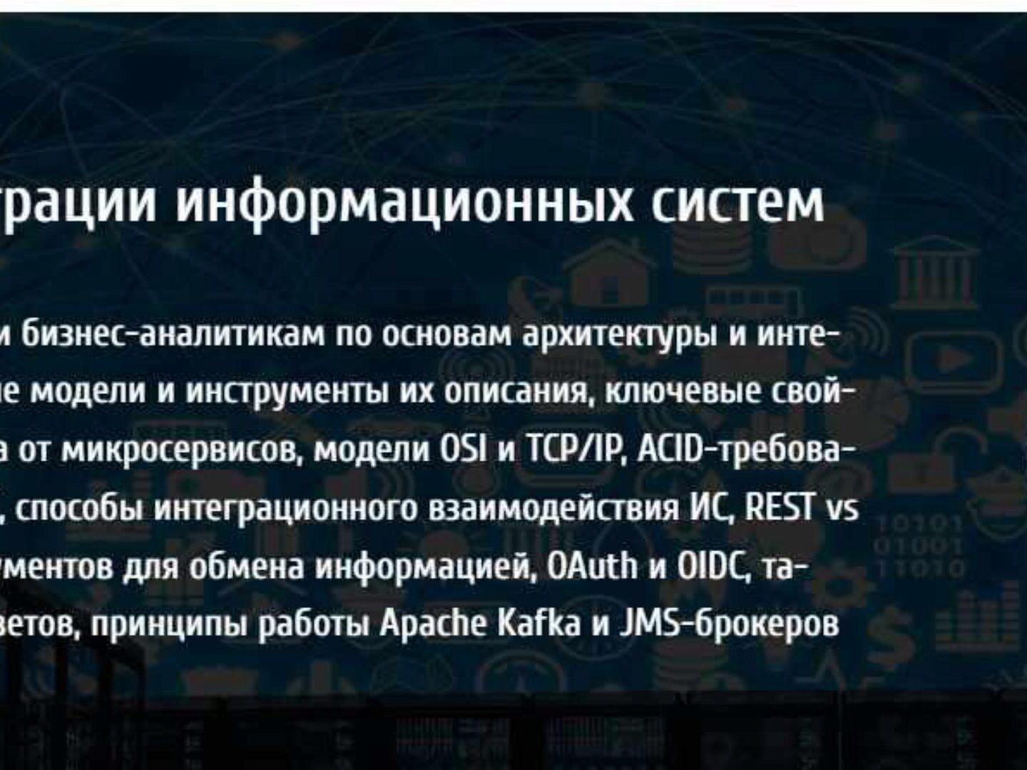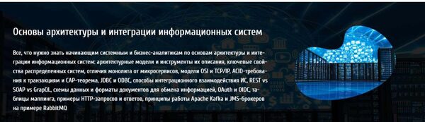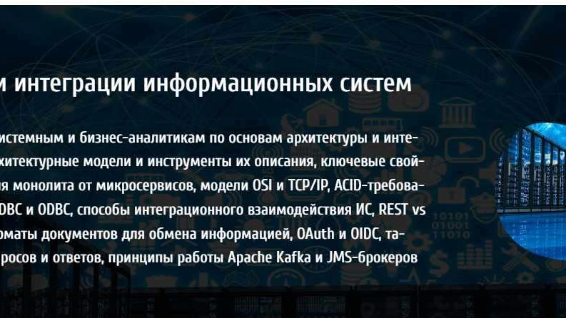 Курс «Основы архитектуры и интеграции информационных систем» ориентирован на начинающих системных и бизнес-аналитиков, которые хотят познакомиться с принципами устройства информационных систем, заглянуть под капот распределенных приложений, понять, что внутри баз данных и каким образом они взаимодействуют между собой через различные способы интеграции.