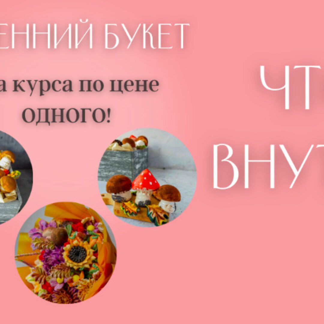 ПРОГРАММА КУРСА: 1) Инструменты и материалы, необходимые для обучения 2) Обзор красителей 3) Каркас для подбукетницы: - подготовка подложки - сборка каркаса - оформление подложки - оформление букета (5 способов) 4) Инвертный сироп (видеоурок) 5) Белковый крем для отработки цветов