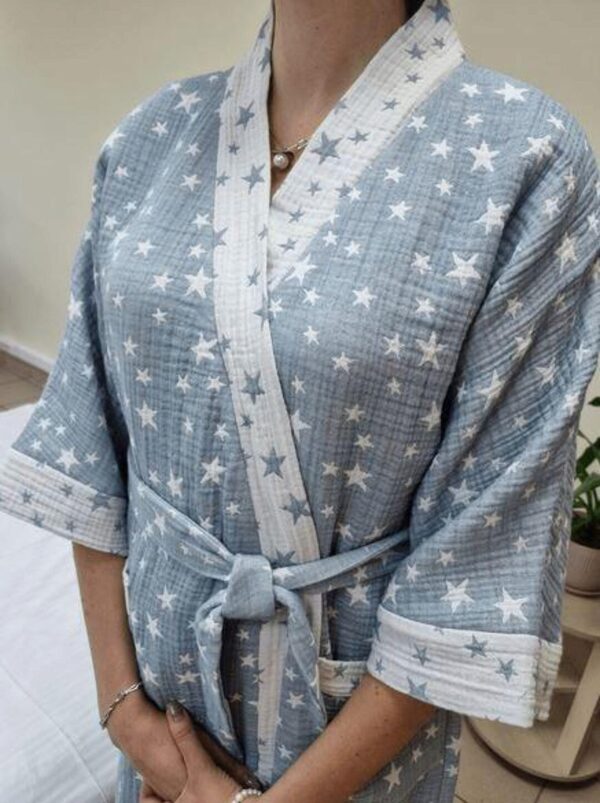 Халат прямого кроя, свободного силуэта. Вырез горловины V-образной формы. Горловина спинки и передние детали обработаны притачной планкой. В боковых швам шлевки для пояса. Халат завязывается на пояс. 2 варианта длины рукава - удлиненный и 3/4 (рукав 3/4 отмечен дополнительной линией внутри рукава).