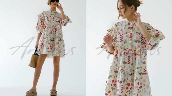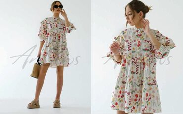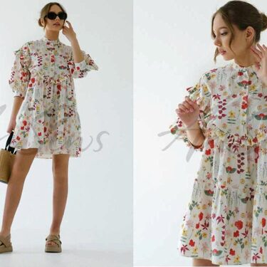 Объемное платье А-силуэта в романтическом стиле из хлопчатобумажного поплина длиной выше колена. Кокетка платья спереди и сзади отделана рюшем по краю. Объёмную, свободную форму платью и рукавам придают сборки, идущие от кокетки. Кокетка переда и воротник-стойка с застёжкой на пуговицы. Рукава по
