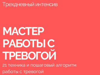 - Часть 3 - четкий пошаговый алгоритм работы для специалистов на примере генерализованного тревожного расстройства (самой гадкой тревожной штуки, и если работает на ней, то сработает и на более скромной тревоге) с разбором каждого шага.