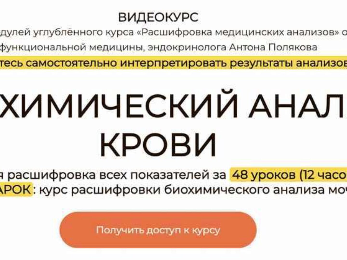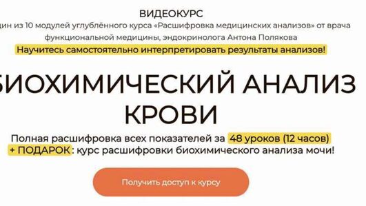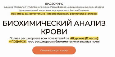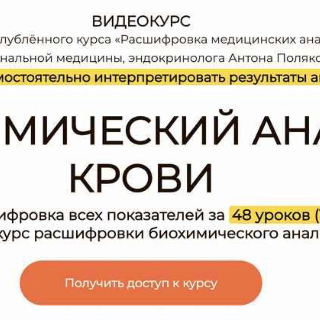 ВИДЕОКУРС один из 10 модулей углублённого курса «Расшифровка медицинских анализов» от врача функциональной медицины, эндокринолога Антона Полякова Научитесь самостоятельно интерпретировать результаты анализов! После прохождения курса ВЫ СМОЖЕТЕ: самостоятельно расшифровывать результаты клинического