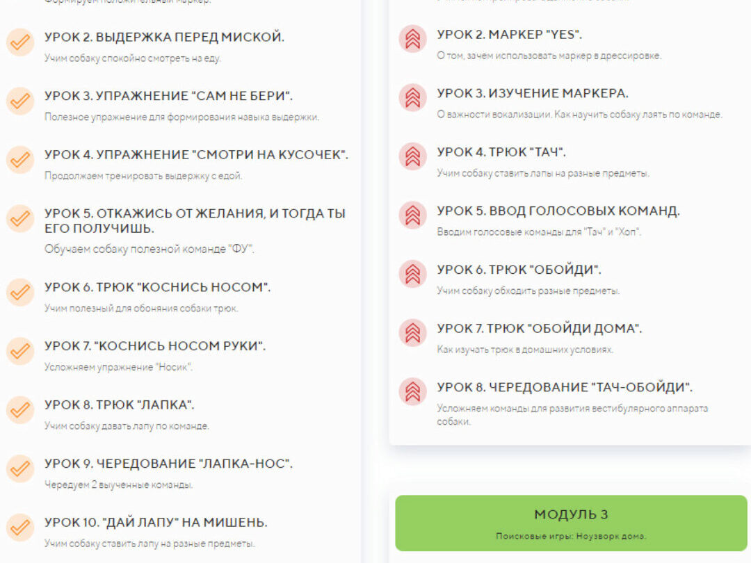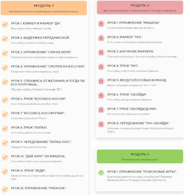 В комплекте 3 модуля: 1 модуль: — Развитие пищевой мотивации. — Упражнение «Липкая собака или Включение». — Упражнение «Мишень» и упражнение «Наведение». — Трюк «Хоп» на наведении. Зачем вообще нужны трюки в обучении. — Прогулка на провисшем поводке. — Упражнение «Дзен»: умение собаки