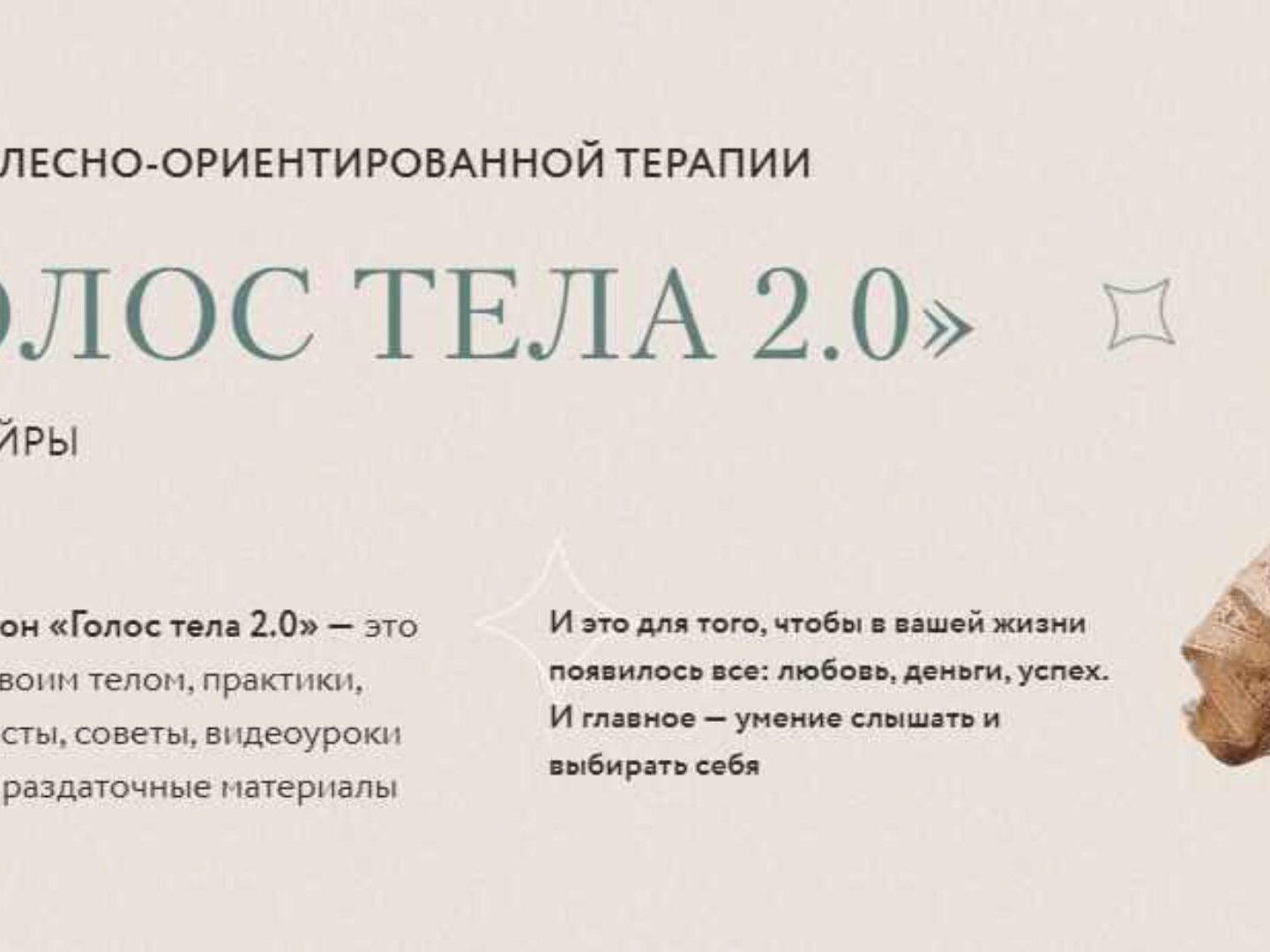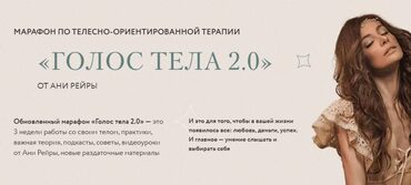 Цену уточняю 3 недели работы со своим телом, чтобы в вашей жизни появилось все: любовь, деньги, успех. И главное — научитесь слышать и выбирать себя МАРАФОН «ГОЛОС ТЕЛА» — ЭТО Три недели практик и конкретных действий, которые изменят ваши отношения с телом навсегда Бонусы: вебинар «Секс и тело»,