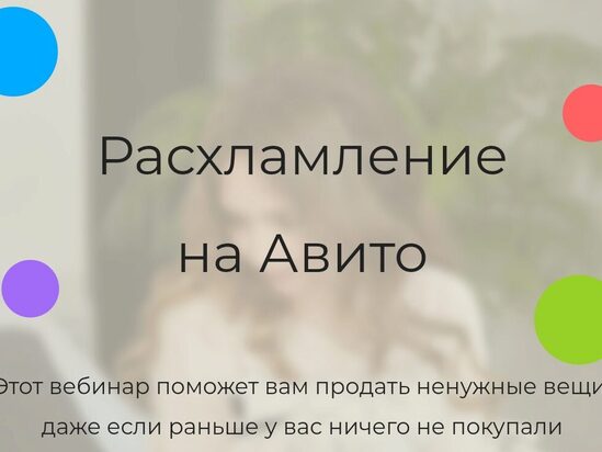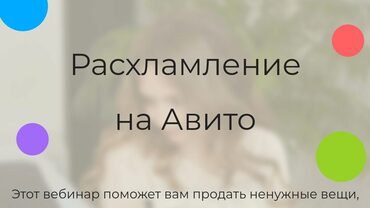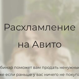 Этот вебинар поможет вам продать ненужные вещи, даже если раньше у вас ничего не покупали. Вебинар для вас, если: Вы хотите расхламить квартиру, но не знаете, куда деть ненужные вещи Вам нужен дополнительный доход У вас не получается продавать на Авито: не звонят, не пишут, не покупают Вы боитесь