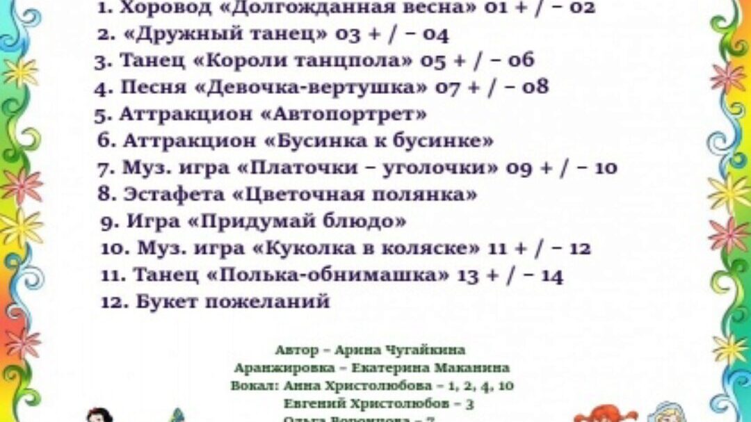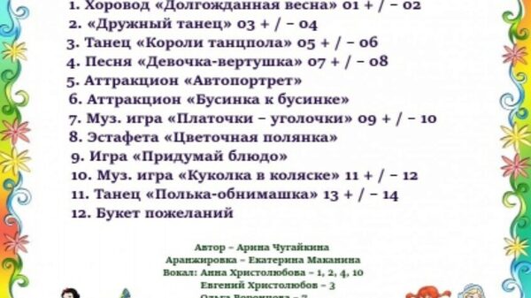 В комплекте авторский сценарий, ноты, плюсы и минусы авторских песен, игр, танцев, хороводов.