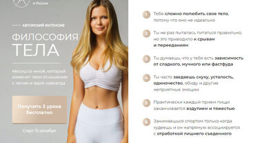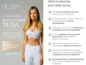Философия тела - первое образование в России, объединяющее в себе главные принципы сбалансированного питания и психологии пищевого поведения Программа интенсива состоит из 9 уроков Урок 0. Вводный урок Урок 1. Инструменты диетомана Урок 2. Лишний вес и переедания Урок 3. Полноценное питание Урок 4.