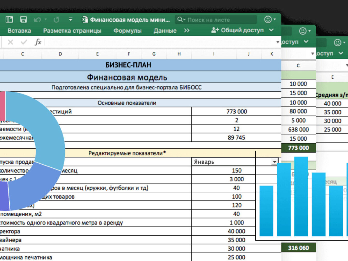 - Общие показатели: Основные показатели (сумма инвестиций, точка безубыточности, срок окупаемости шаурмы, средняя ежемесячная прибыль) и список редактируемых показателей