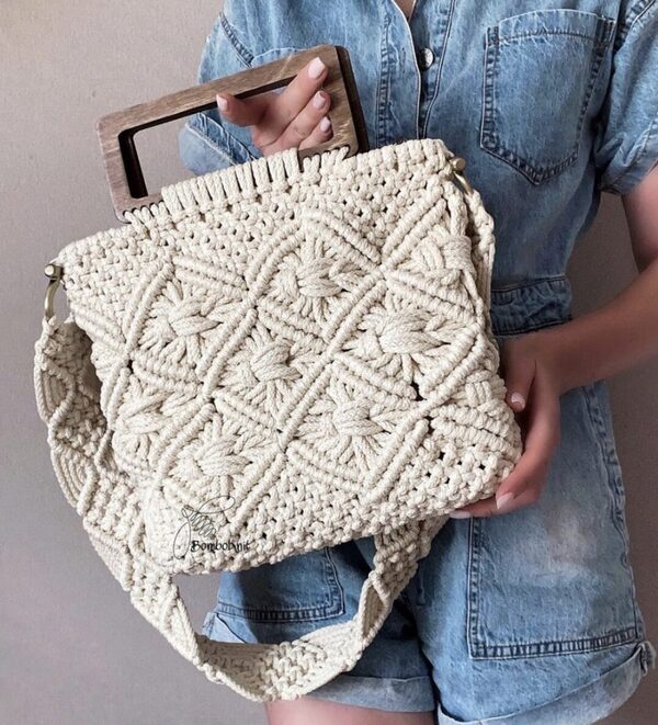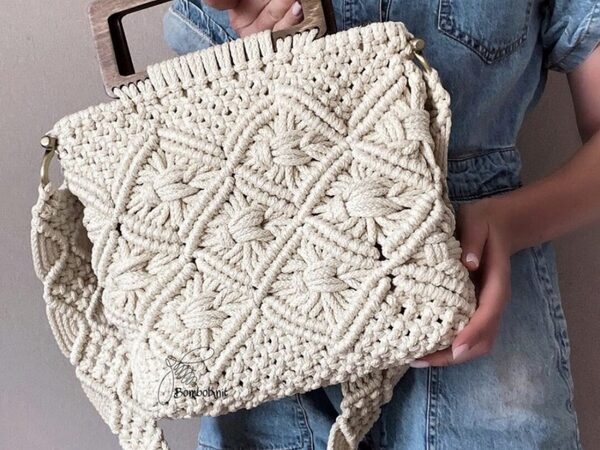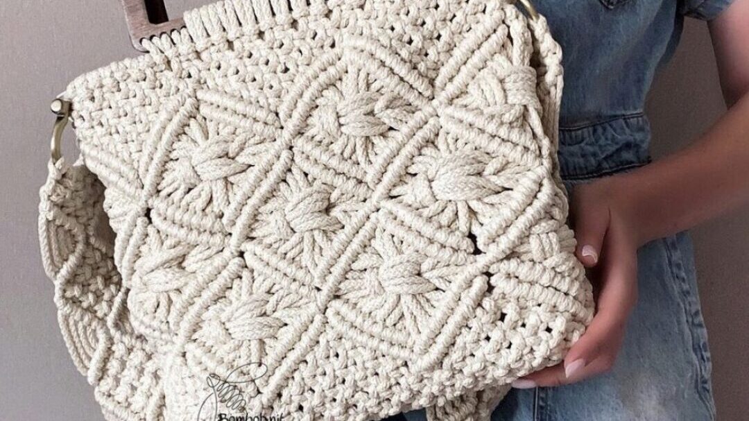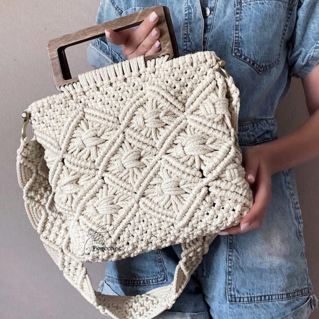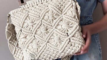 ⠀⠀Вы научитесь плести сумочку в стиле макраме необычным объемным узором, плести ручку для сумочки и крепить ее к креплениям, формировать дно сумочки, шить подклад!