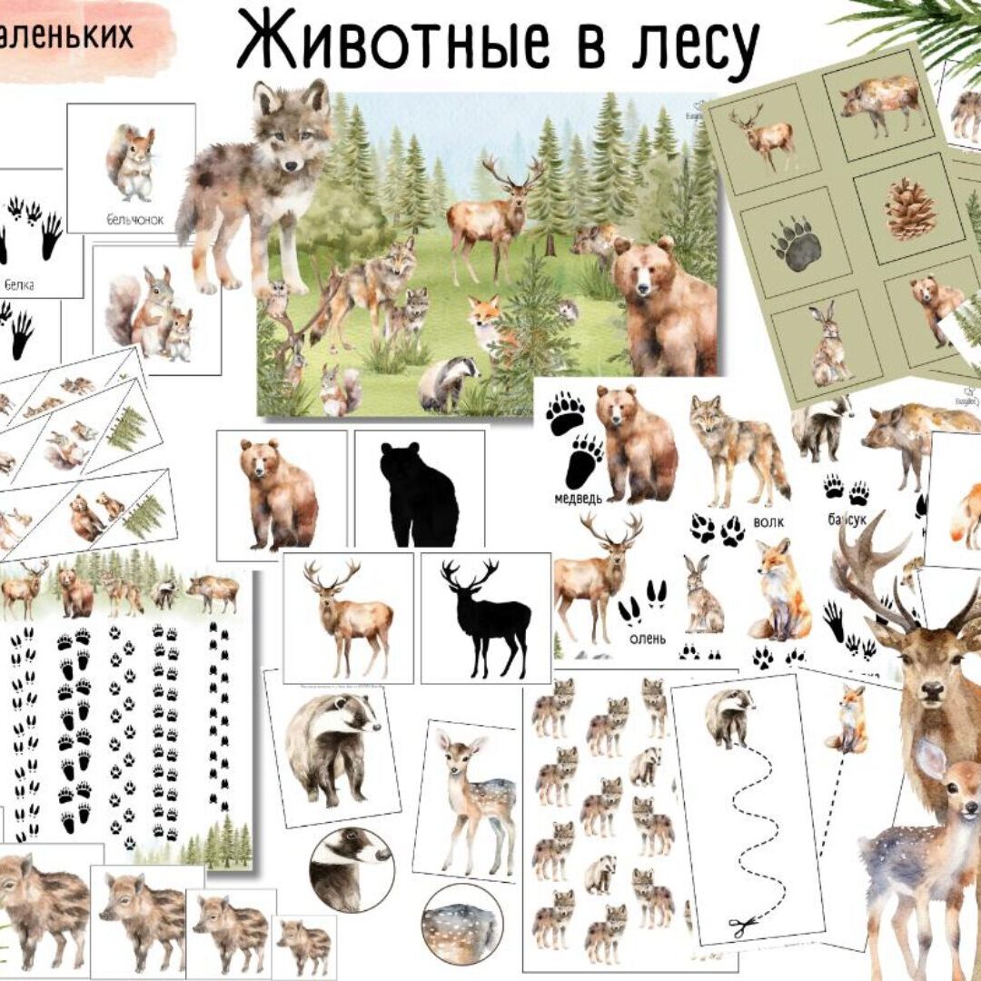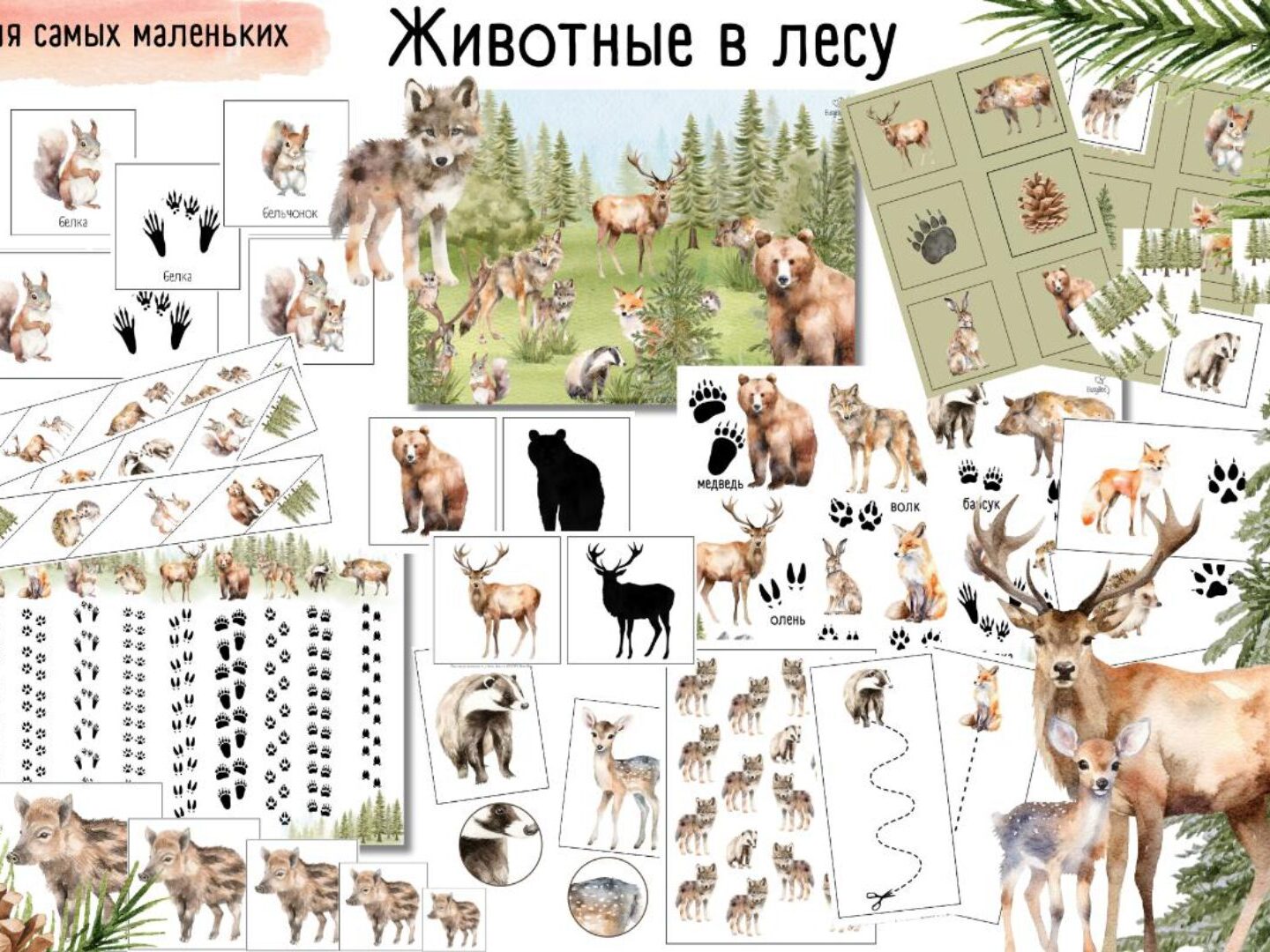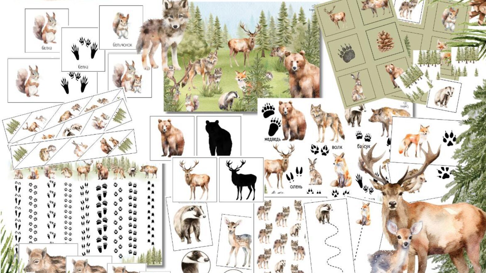 -Карточки «Животные в лесу» (животное/детеныш/животное с детенышем/след с подписью/животное+следы