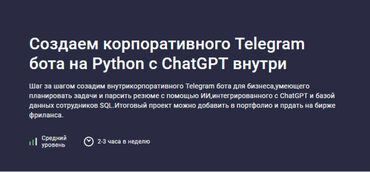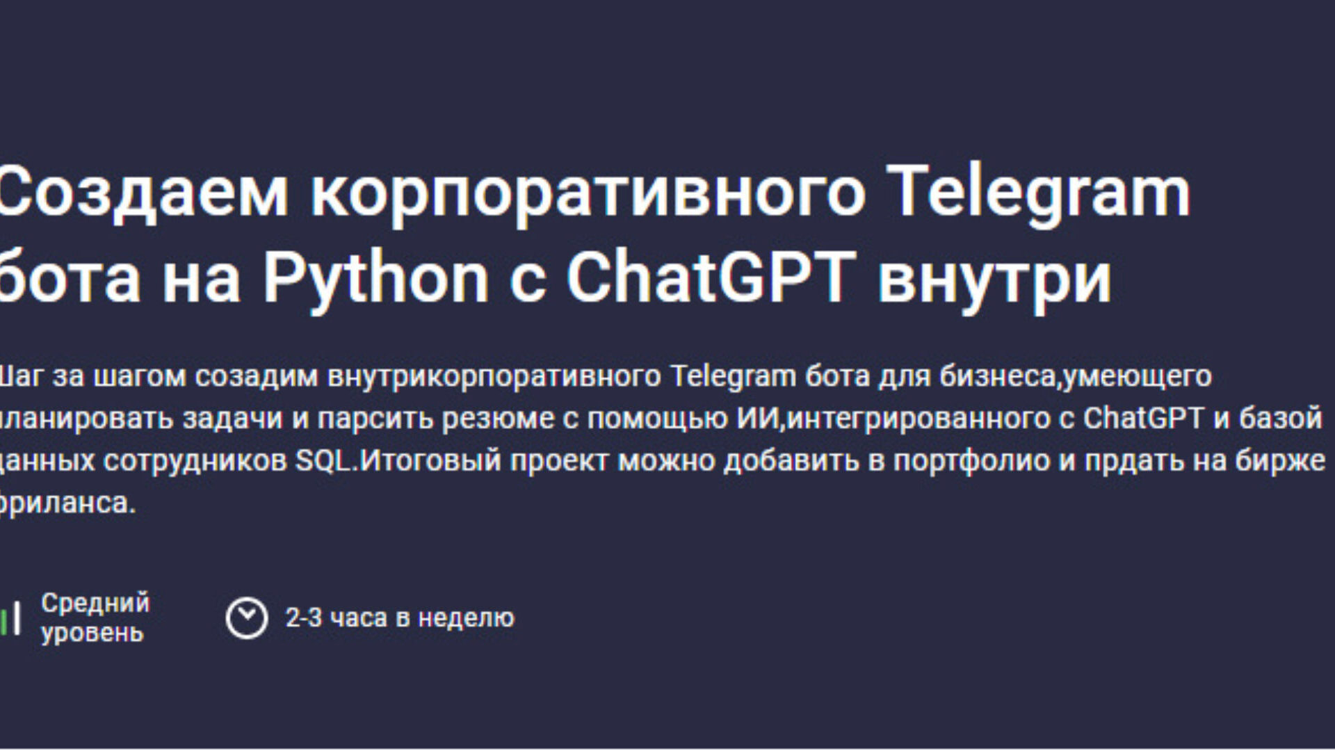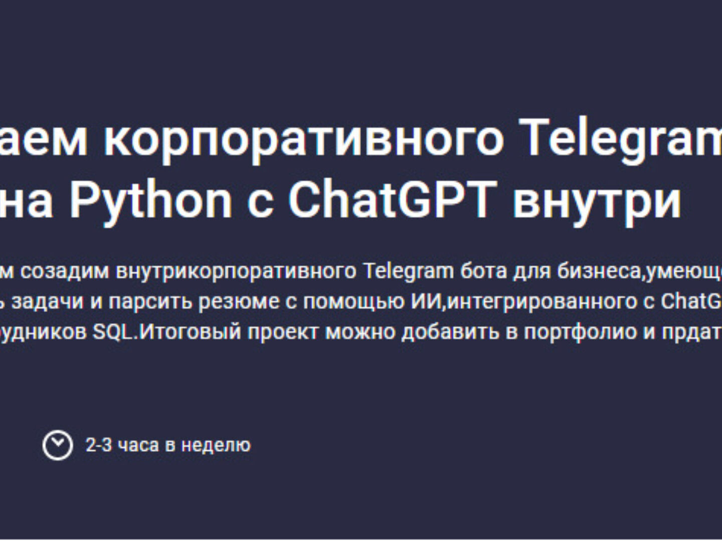 Шаг за шагом создадим внутрикорпоративного Telegram бота для бизнеса, умеющего планировать задачи и парсить резюме с помощью ИИ, интегрированного с ChatGPT и базой данных сотрудников SQL.Итоговый проект можно добавить в портфолио и продать на бирже фриланса.