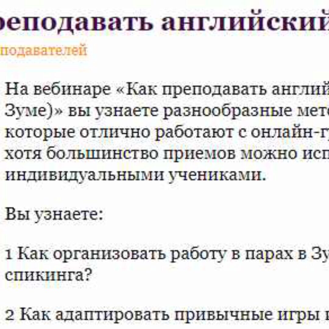 Об этом мы и поговорим на вебинаре «Как преподавать английский онлайн группам (в Зуме)». Вебинар будет полезен и тем, кто уже, и тем, кто еще не...))