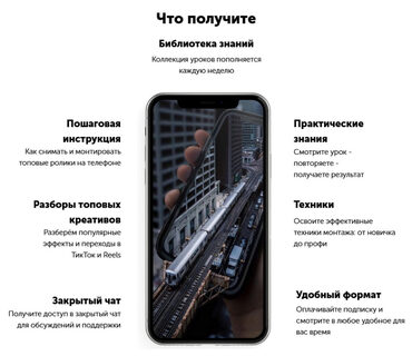 Вы получите: курс по съемке коротких трендовых видео со сложным монтажом. Научись создавать трендовые видео и повторять любые ролики из Reels и Tiktok клипы ВК, YOUTUBE SHORTS И ЯНДЕКС ДЗЕН Подробные видео уроки с разбором трендовых видео Обновления уроков по новым трендам Вводный урок - концентрат