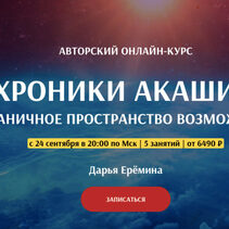 Трансформация жизни через Хроники Акаши На этом практикуме Вы: - получите ответы на Ваши важные жизненные вопросы по поводу Миссии и Предназначения Души, отношений, денег и процветания, здоровья - установите прочную связь с наставниками своей Души. Научитесь получать доступ к необходимой Вам