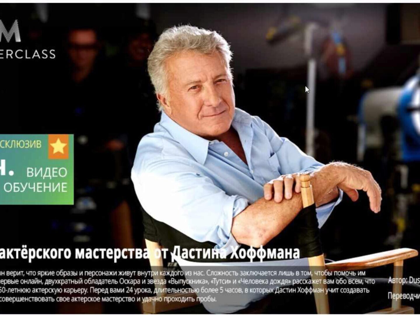 Перед вами 24 урока, длительностью более 5 часов, в которых Дастин Хоффман учит создавать яркие образы, совершенствовать свое актерское мастерство и удачно проходить пробы.