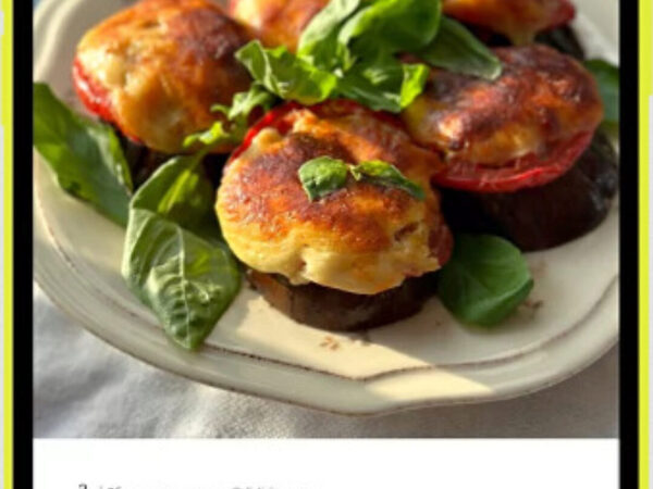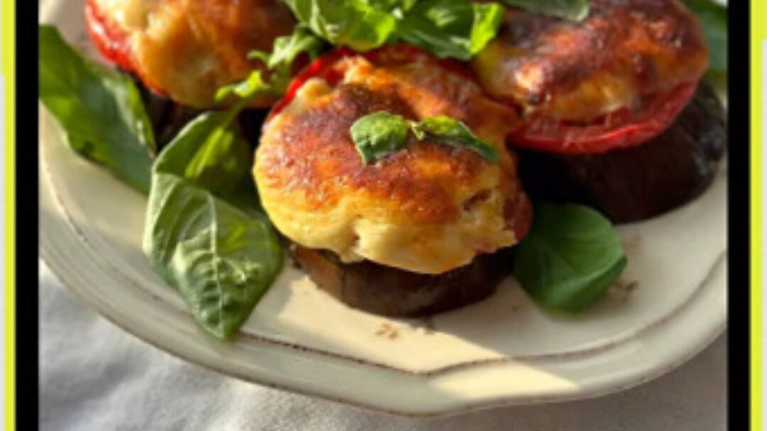 Запечённый баклажаны с фаршем под томатной шапочкой