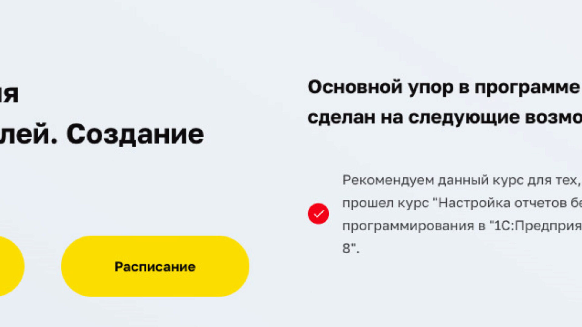 Рекомендуем данный курс для тех, кто прошел курс «Настройка отчетов без программирования в »1С:Предприятие 8«.