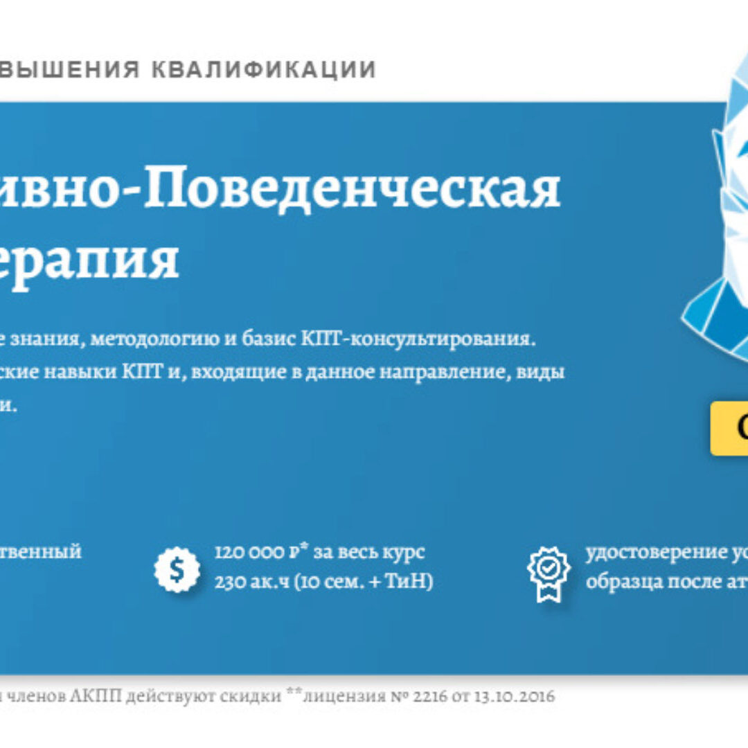 Часть 1. Основы КПТ. Теория и практика.Октябрь 2020. Цель семинара — двухдневный онлайн семинар поможет понять особенности направления работы специалиста, освоить принципы взаимодействия в парадигме КПТ, разобрать различные методы работы с клиентами, сориентироваться в современных течениях