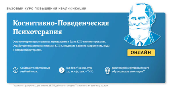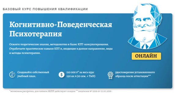 Часть 1. Основы КПТ. Теория и практика.Октябрь 2020. Цель семинара — двухдневный онлайн семинар поможет понять особенности направления работы специалиста, освоить принципы взаимодействия в парадигме КПТ, разобрать различные методы работы с клиентами, сориентироваться в современных течениях