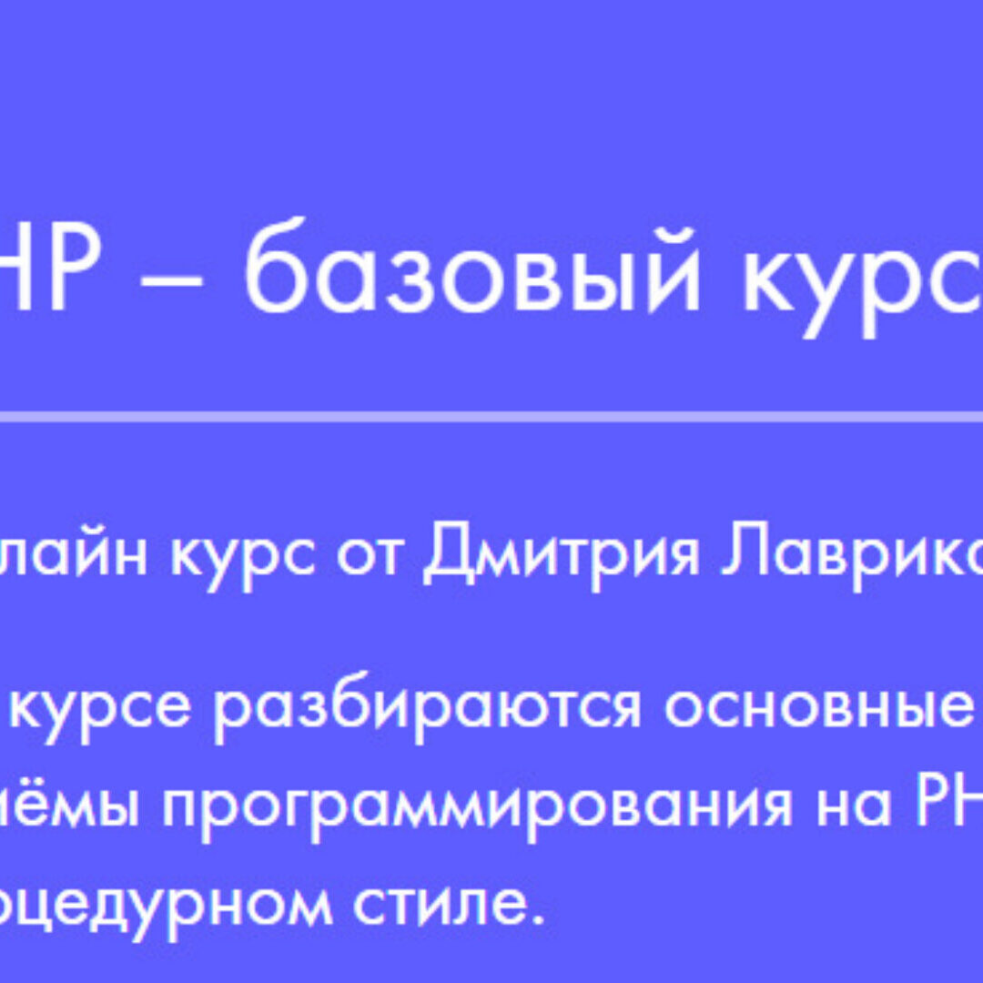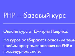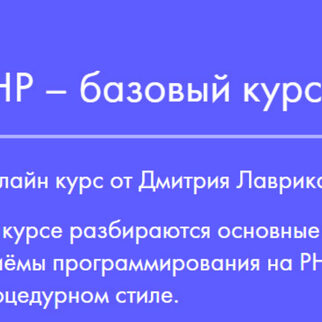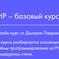PHP – базовый онлайн курс от Дмитрия Лаврика. На курсе разбираются основные темы и приёмы программирования на PHP в процедурном стиле.