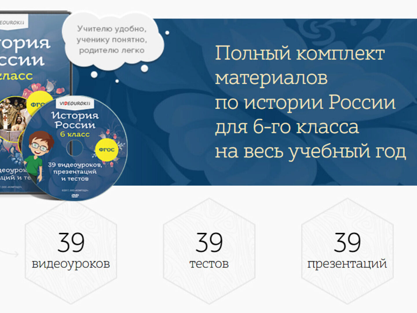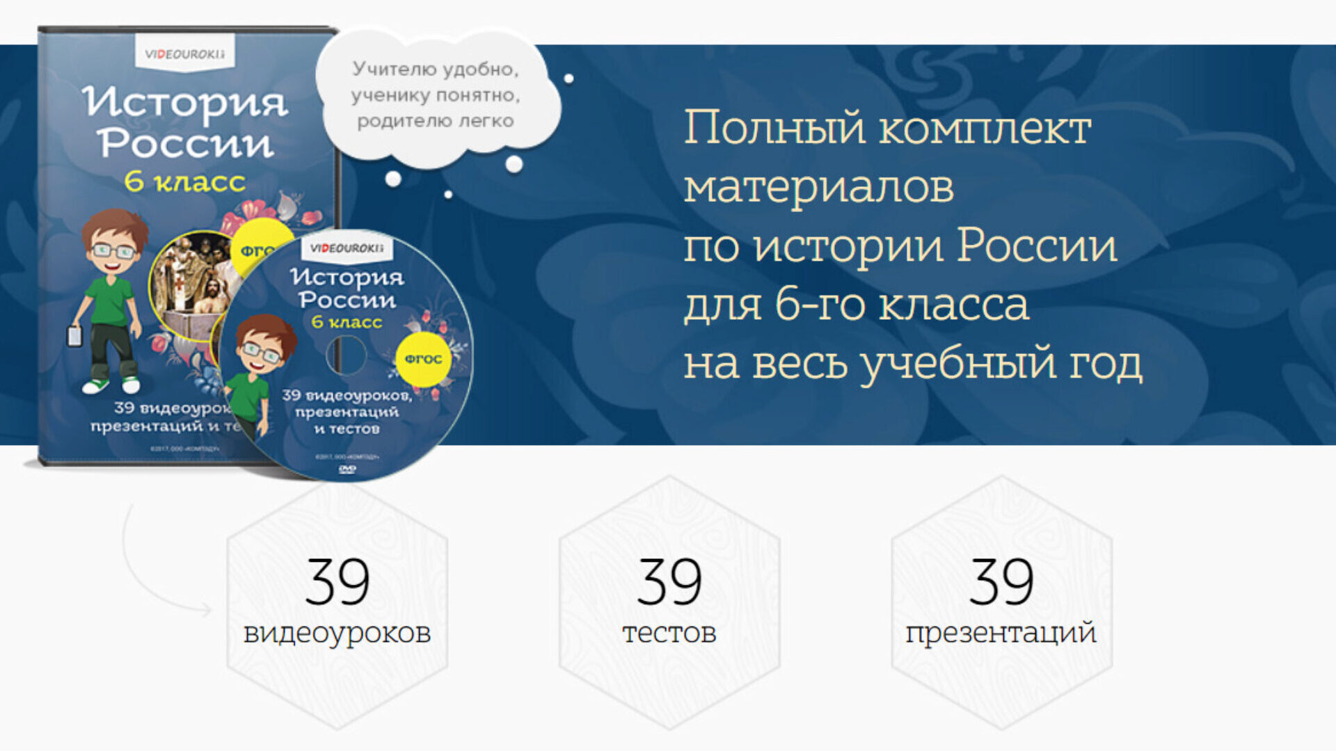 - Содержит 39 видеоуроков, 39 тестов и 39 презентаций.