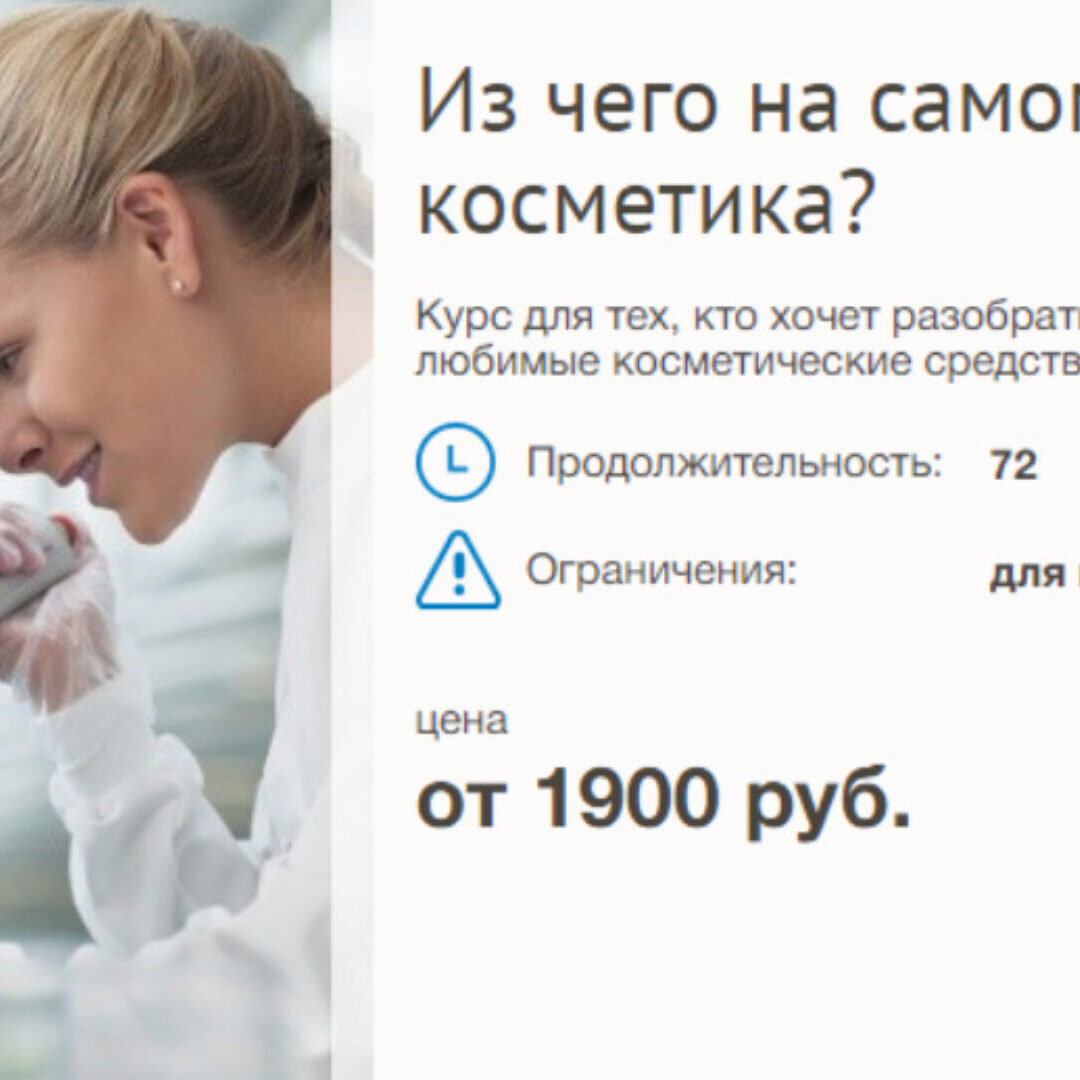 Вы изучите основные действующие вещества, входящие в состав косметики, и научитесь читать этикетки косметических средств. Перед вами откроется увлекательных мир косметической химии, посетив который, вы станете намного более компетентным и опытным потребителем.