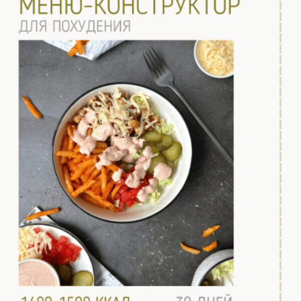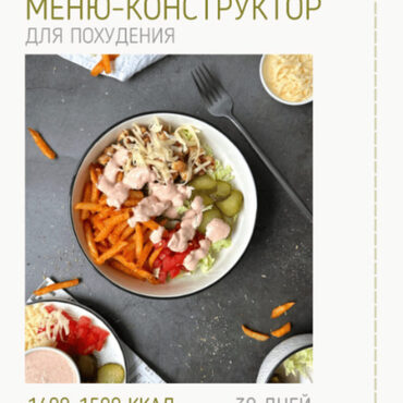 Программа питания представляет собой раписанный рацион на 30 дней для похудения. ТАКЖЕ В ДАННЫЙ ПАКЕТ ВХОДИТ НОВЫЙ МЕНЮ-КОНСТРУКТОР Как это работает? 1. Вы получаете расписанный рацион с рецептами 2. Готовите и питаетесь по меню 3. Комфортно худеете, питаясь без жестких ограничений ДО -7 КГ В МЕСЯЦ