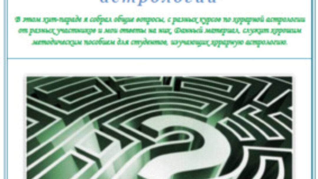 В этом хит-параде я собрал общие вопросы, с разных курсов по хорарной астрологии от разных участников и мои ответы на них. Данный материал, служит хорошим методическим пособием для студентов, изучающих хорарную астрологию.