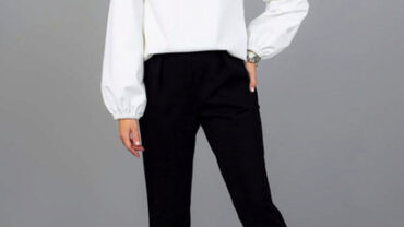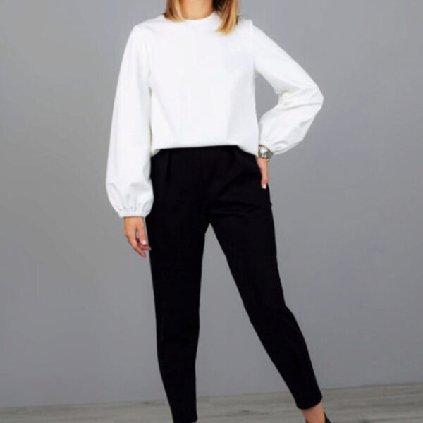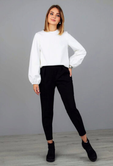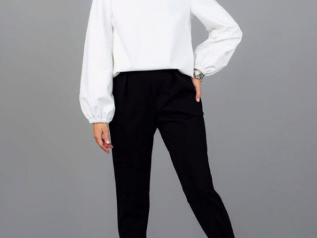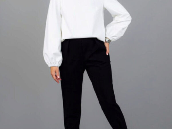 Костюм состоит из жакета и брюк: Жакет умеренного объема прямого силуэта с цельнокроеным воротником-стойкой, переходящим в вырез «Звезда» и цельнокроеным рукавом с ластовицей, переходящей с бочок с нагрудной вытачкой, карманами и шлицами Брюки прямые, широкие на резинке с лампасами и 4-мя карманами