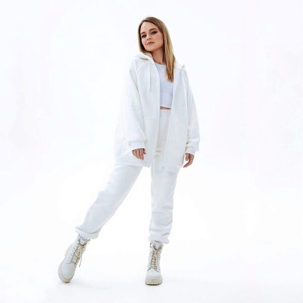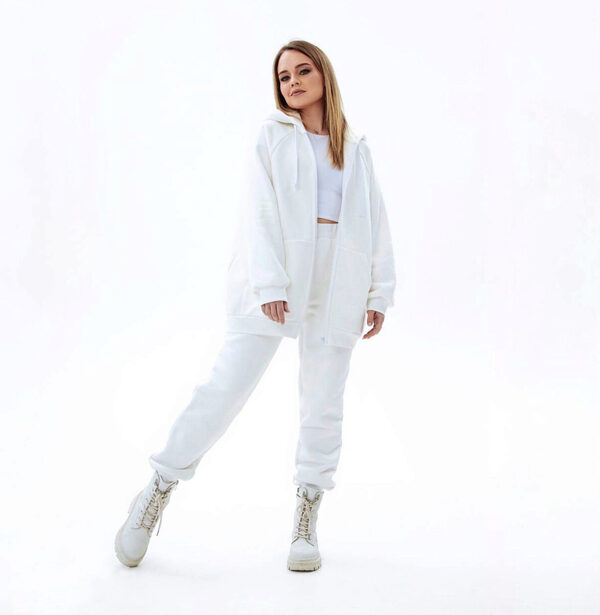 Костюм «Чёрный» Толстовка большого объёма, прямого силуэта. По центру переда расположен вертикальный накладной шов с необработанным срезом. Линия плеча спущена, длинный рукав рубашечного покроя. По низу рукавов - притачные манжеты. Вырез горловины округлой формы, обработан притачной обтачкой. По