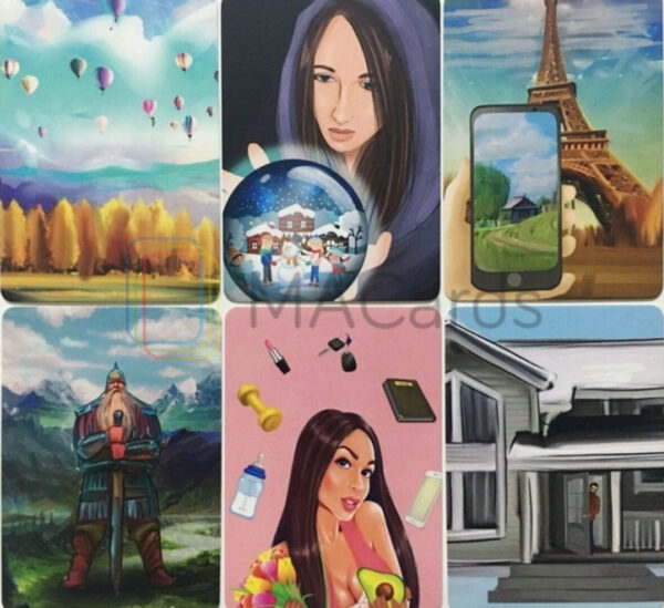 Две колоды по 88 карт каждая – одна состоит из картинок, другая из слов. Поместите карту с изображением в обрамление карты со словом и исследуйте значение этой комбинации. Возможны 7744 различных комбинаций, и множество интерпретаций. Используйте отдельно каждую колоду как пасьянс и вместе для