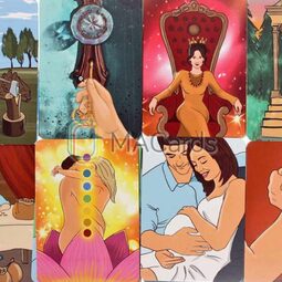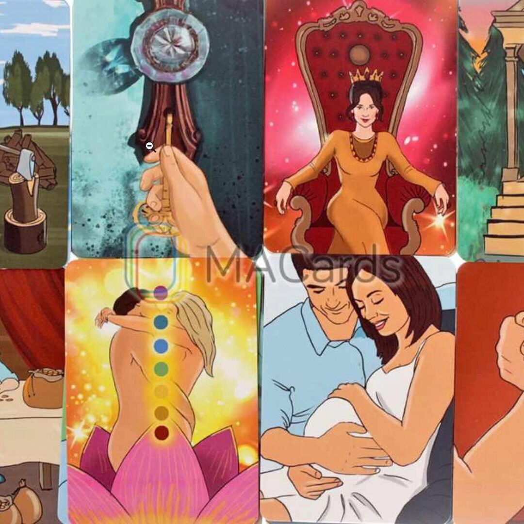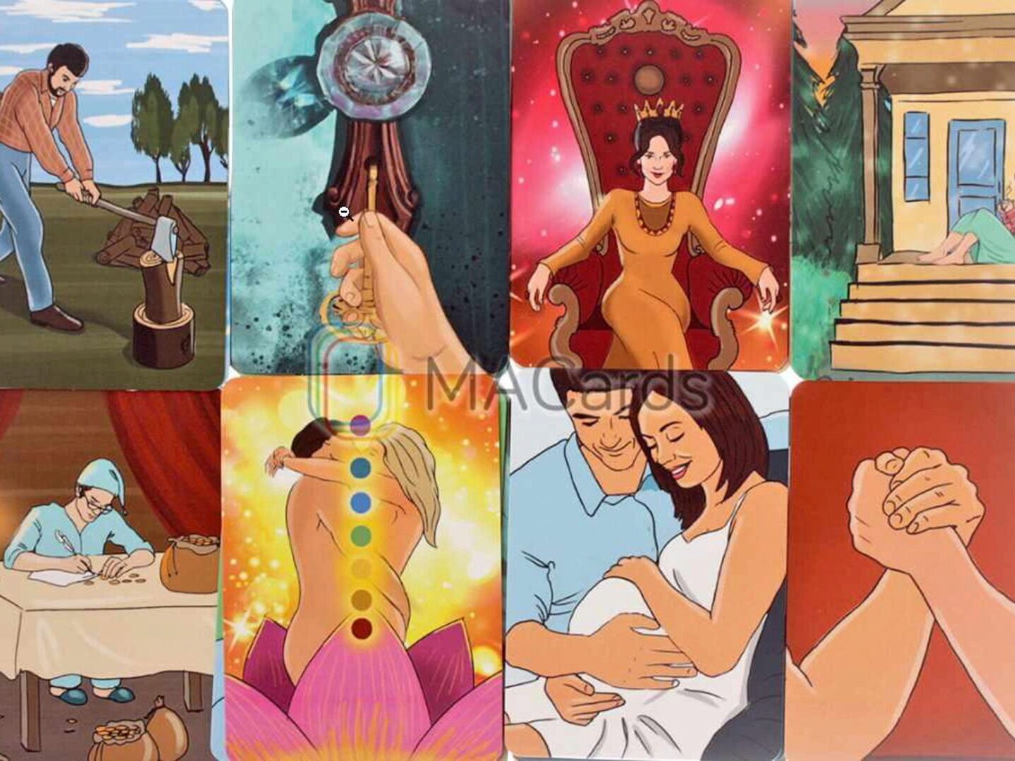 Две колоды по 88 карт каждая – одна состоит из картинок, другая из слов. Поместите карту с изображением в обрамление карты со словом и исследуйте значение этой комбинации. Возможны 7744 различных комбинаций, и множество интерпретаций. Используйте отдельно каждую колоду как пасьянс и вместе для