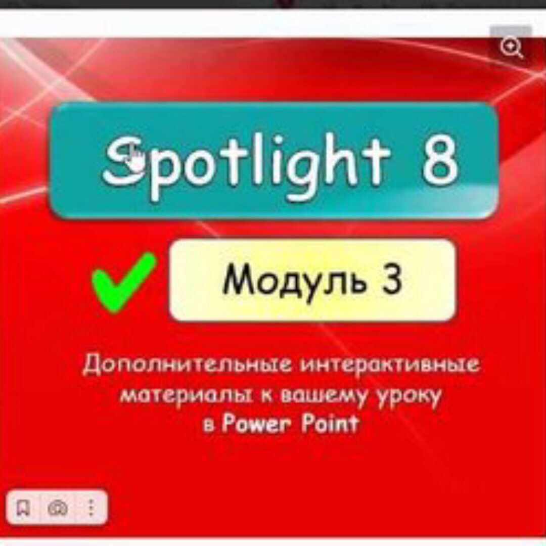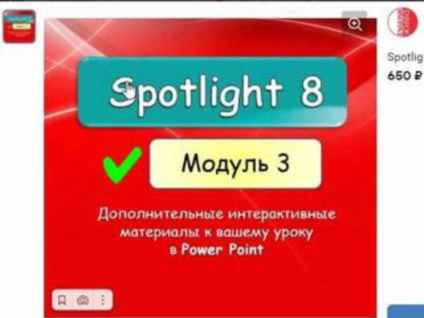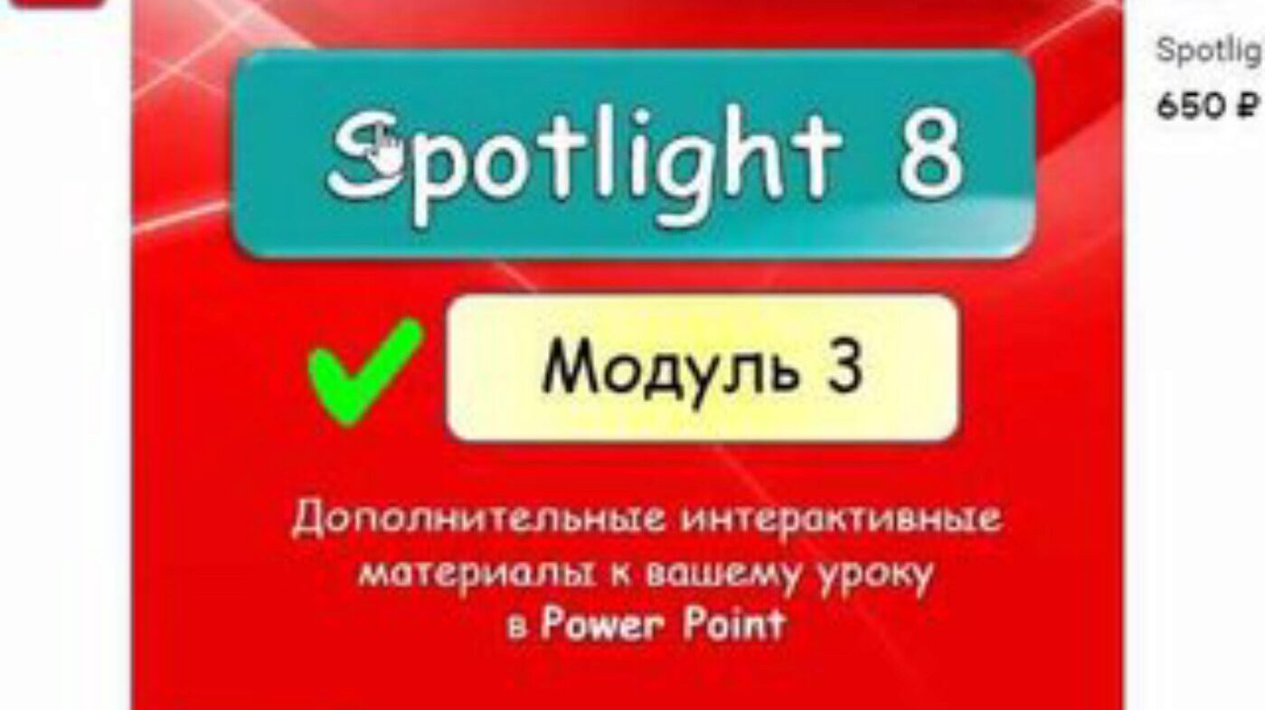 ТА-ДАААМ Встречаем SPOTLIGHT 8 Module 4 ГОТОВЫЕ интерактивные уроки уже ждут вас! Мы вложили время, труд, энергию и любовь ДЛЯ ВАС, дорогие! На работе нужно отдыхать! Внутри: 1. Дополнительные упражнения 2. Отработка слов 3. Теория и практика по грамматике 4. Юмор, наш юмор)) Авторы учебника