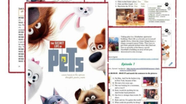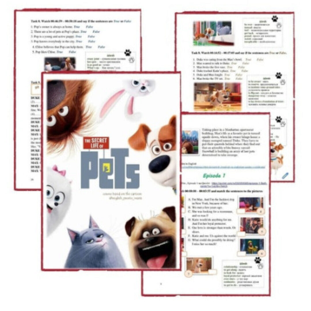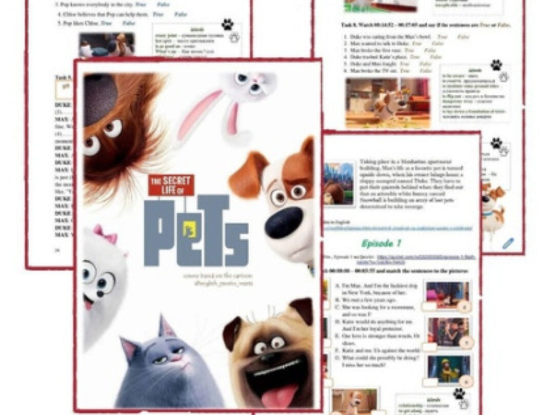 Пушистый курс для начинающих студентов по мультфильму «Тайная жизнь домашних животных». Уровень - Elementary Весь мультфильм минута за минутой будет просмотрен и проработан вашими учениками. Они поверят в свои силы. Курс - это набор материалов: - рабочая тетрадь в формате PDF (подходит для онлайн и