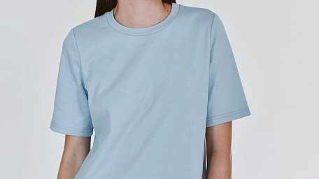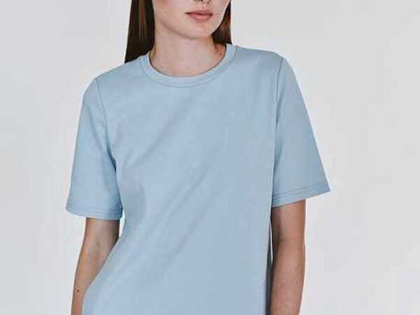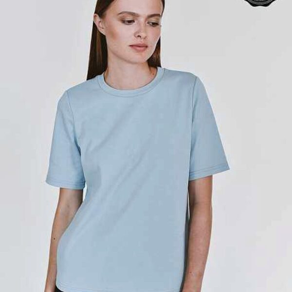 Футболка женская свободного силуэта, длиной до середины бедра. Рукав втачной, горловина обработана бейкой из основной ткани.