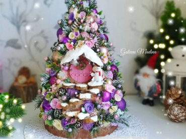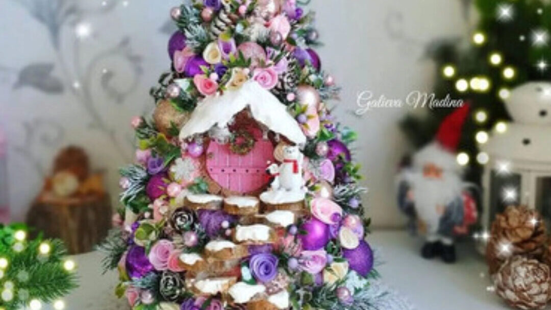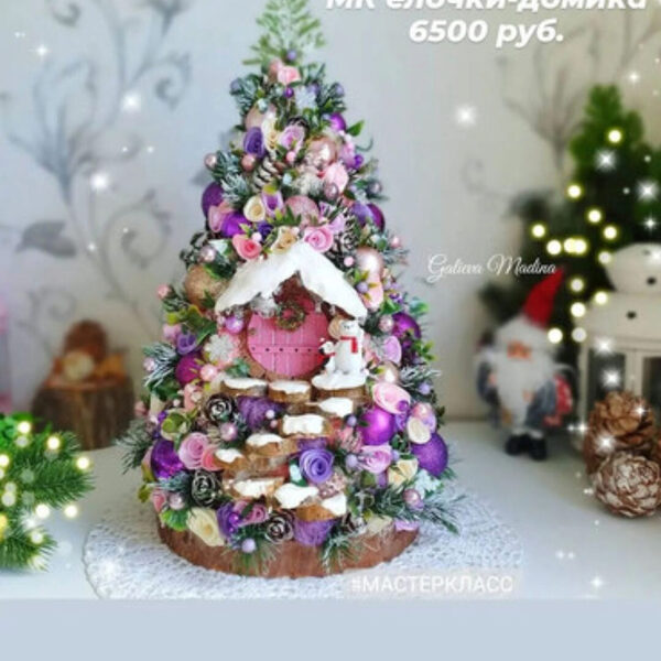 - В МК вы научитесь тому, как сделать самому основу-конус для елки, дверцу, крышу, ступеньки, атласные розы, как правильно и красиво декорировать елочку , как сделать снег, сосульки, веночек на дверцу, фонарик над крыльцом и многие другие секреты.