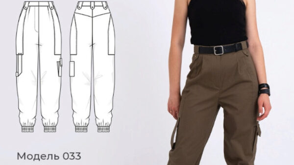 Выкройка брюк большого объема, прямого силуэта. Линия талии на естественном месте. Пояс притачной, внутри пояса эластичная тесьма. На передних половинках брюк наклонные карманы с подзором. По боковой части брюк расположены карманы портфель с клапанами на липучках, и держателями из киперной ленты.