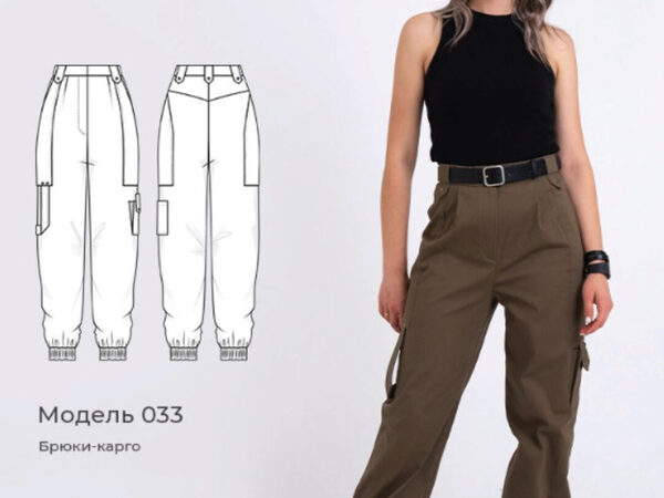 Брюки-карго Джой Выкройка брюк-карго прямого силуэта, умеренный оверсайз. Линия талии занижена. Цельнокроеный пояс с эластичной тесьмой (резинкой). В верхней части брюк расположены карманы с отрезным бочком, на уровне колена по боковым швам брюк - накладные карманы с клапанами. Низ брюк оформлен