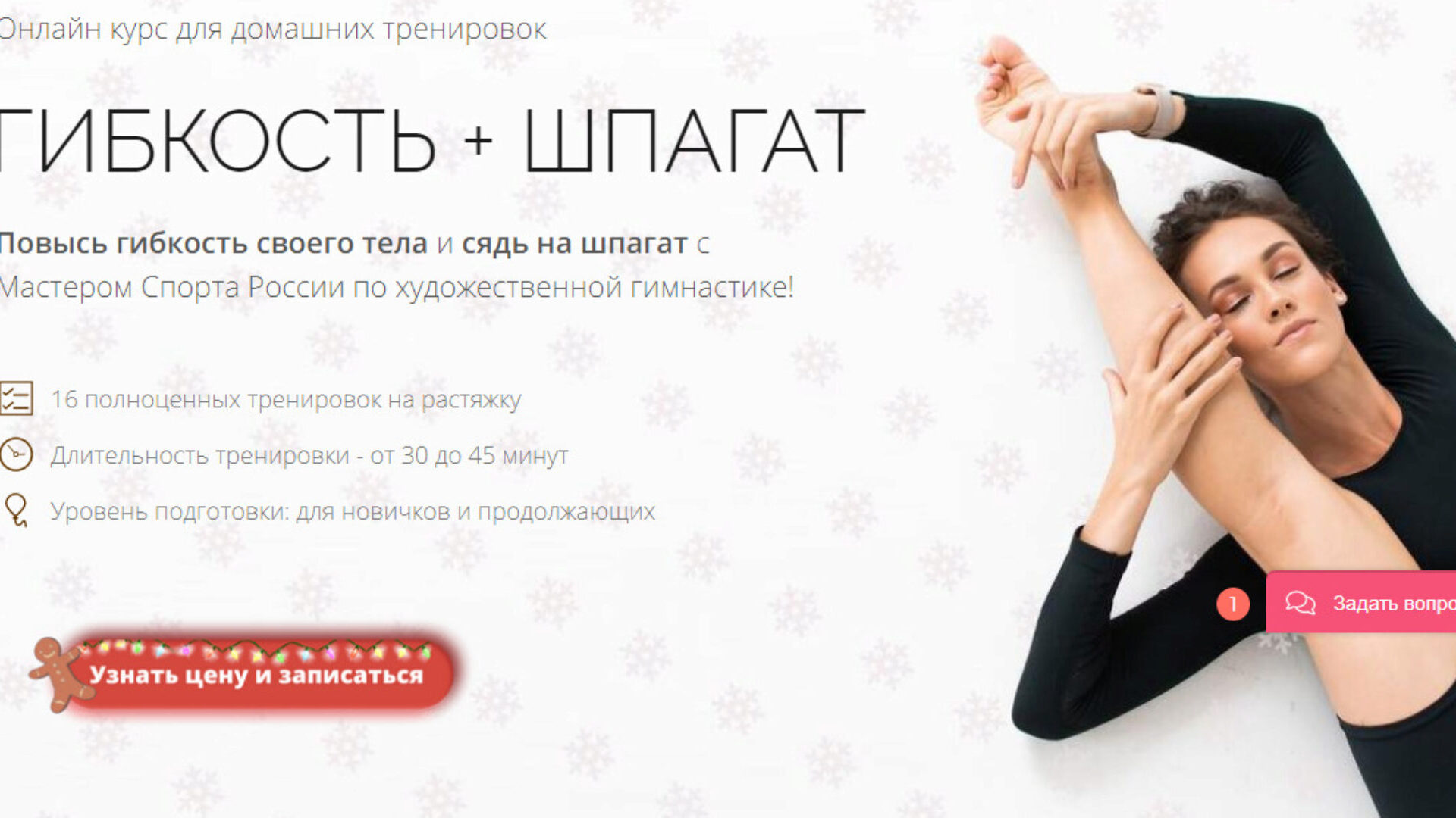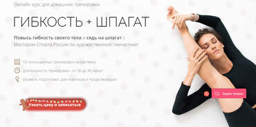 Что ты получишь на курсе: 20 видео-тренировок в формате «включай и повторяй» с голосовым сопровождением тренера и титрами авторская методика развития гибкости от мастера спорта России по художественной гимнастике рабочие упражнения от «простого к сложному», которые приведут к результату даже если