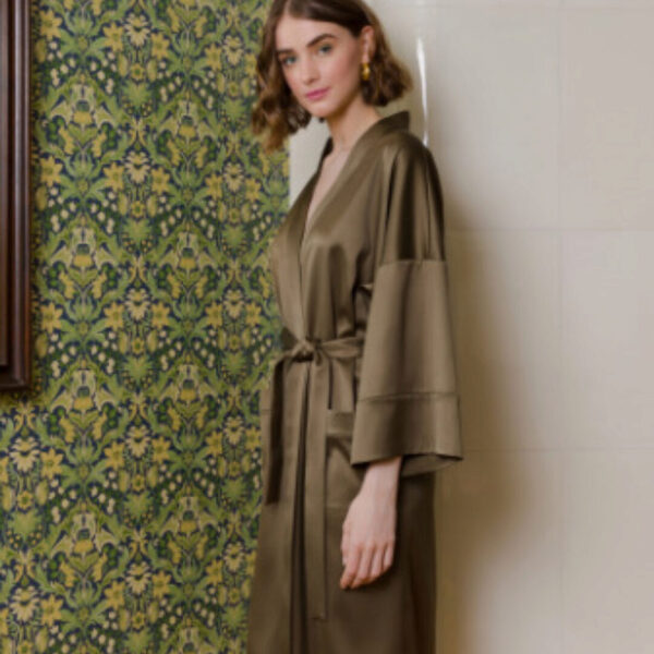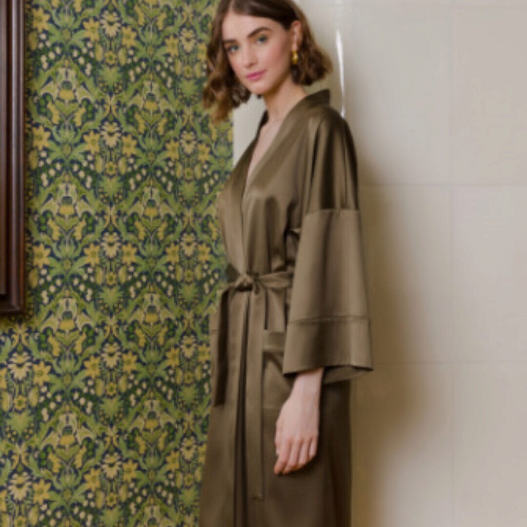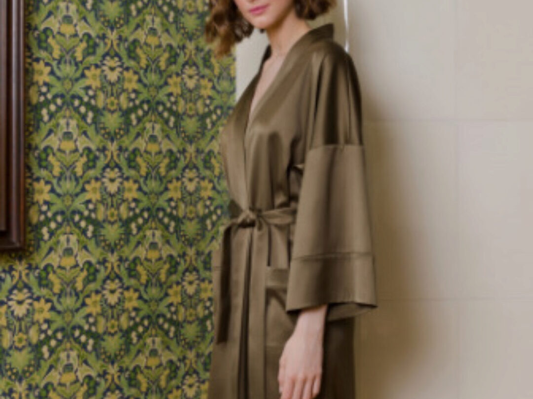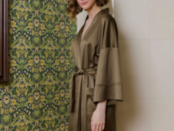 Изысканный шёлковый халат-кимоно «Бри» – стильное и удобное решение для домашнего гардероба любой женщины. Удобная посадка халата «Бри» обеспечивает свободу движений и подходит для отдыха, сна и проведения времени в кругу семьи или друзей. У модели спущенный рукав и удобный воротник-стойка. Все швы