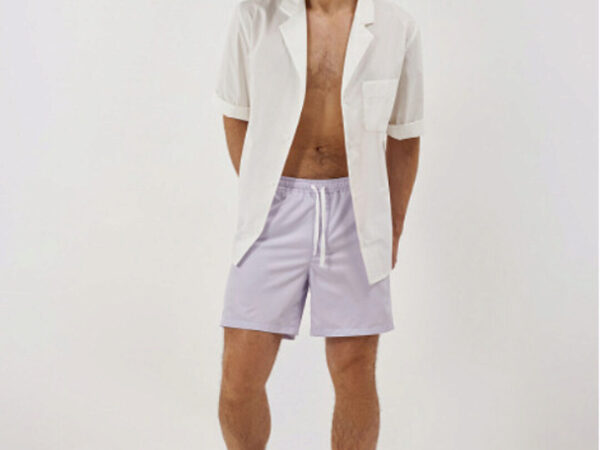 Выкройка шорт. Шорты прямые, выше колена, с застежкой «гульфик». Передние половинки имеют карманы из бокового шва с косым входом. Также на передних половинках присутствует по две складки с каждой стороны. На задней половинке справа имеется карман «в рамку». Верхний срез обработан притачным поясом.