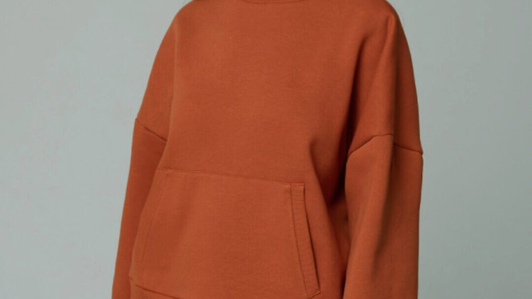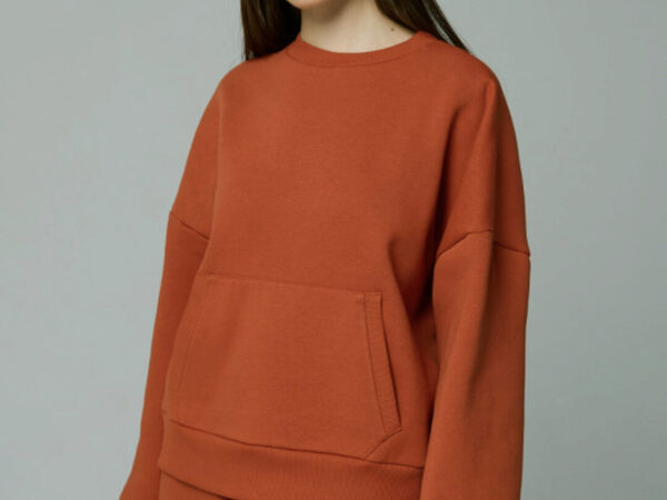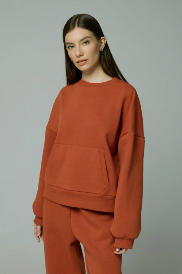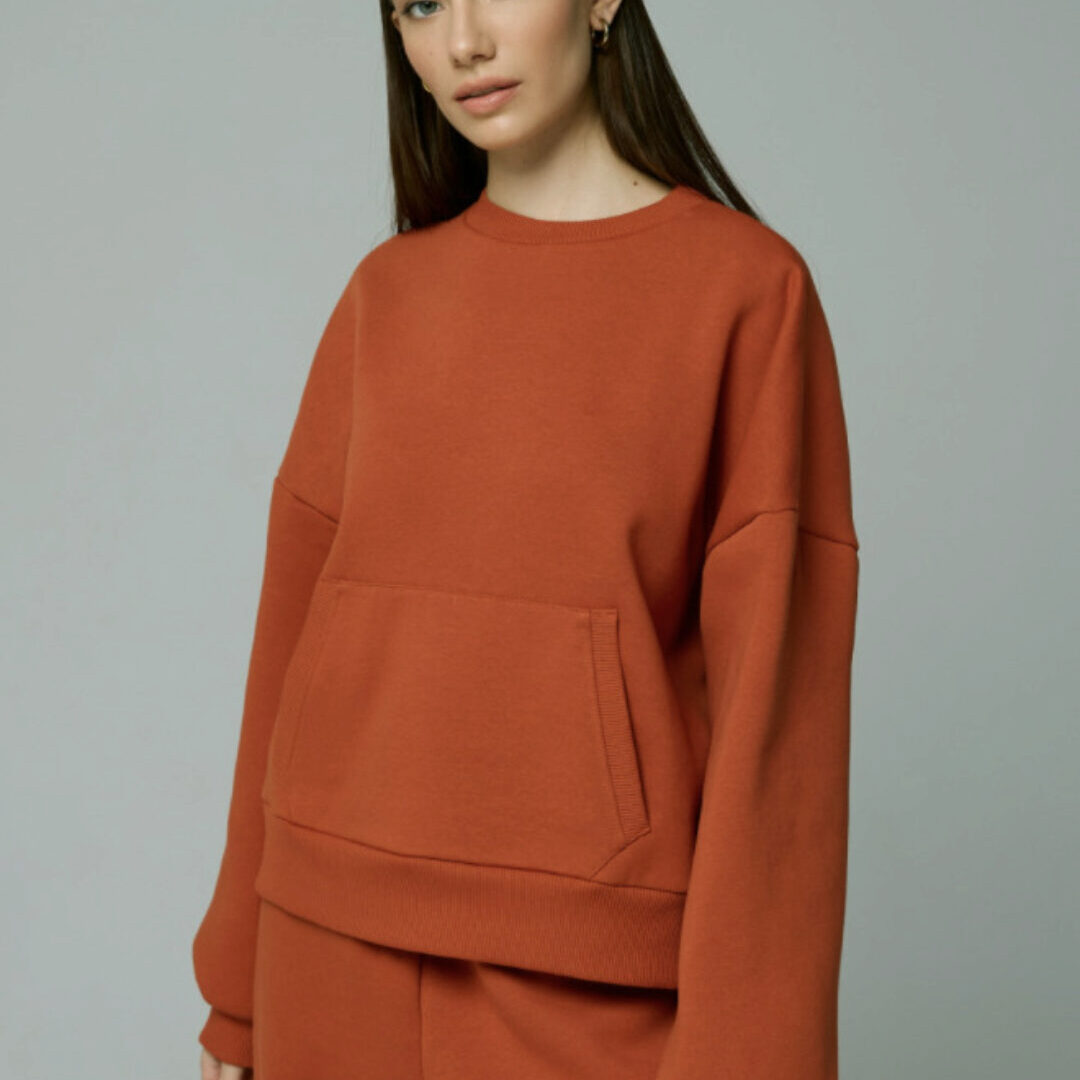 Свитшот свободного объема прямого силуэта в стиле оверсайз, длиной выше линии бедер. Низ изделия обработан притачным поясом из кашкорсе (рибаны). На детали переда расположен накладной карман «кенгуру» без подкладки. Линия плеча удлинена. Рукав рубашечный, удлиненный. Низ рукава оформлен притачной манжетой из кашкорсе (рибаны). Горловина круглая, обработана обтачкой из кашкорсе (рибаны).