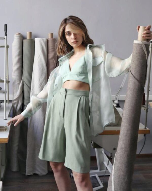 Трусы-шорты прямого силуэта умеренного объема, длиной выше середины бедер, без боковых швов. Линия талии на естественном месте. Срез талии обработан цельнокроеным поясом с эластичной тесьмой. По среднему шву передней половинки оформлен ложный гульфик.