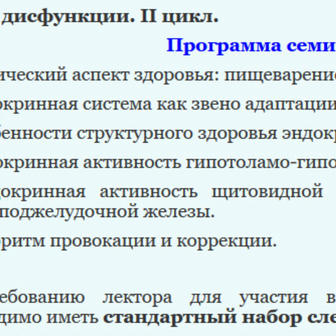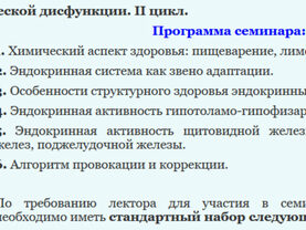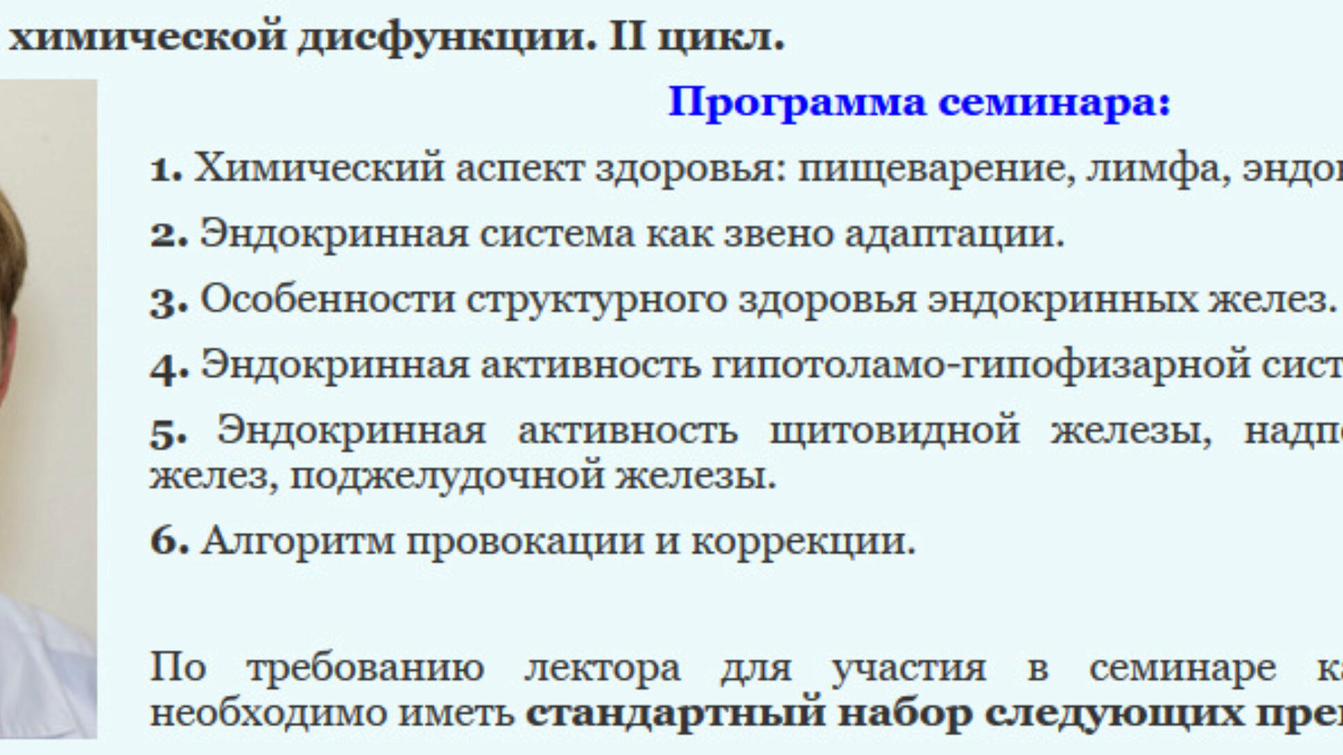 По требованию лектора для участия в семинаре каждому участнику необходимо иметь стандартный набор следующих препаратов: