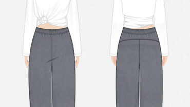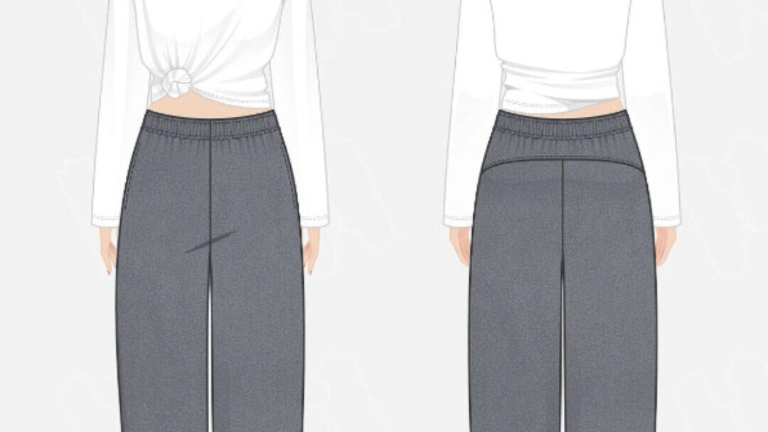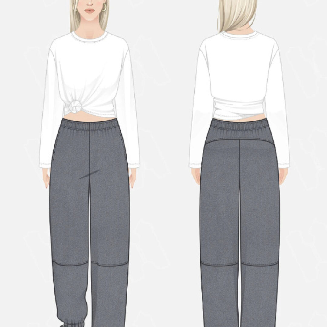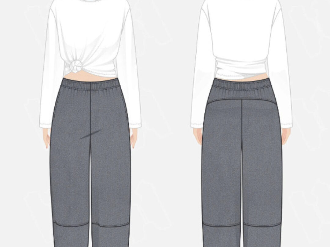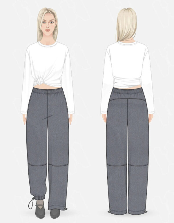Горизонтальные подрезы и кокетка с отделочной строчкой. Низ брюк обработан плоскошовной машиной и оформлен кулиской с эластичным шнуром и фиксатором.