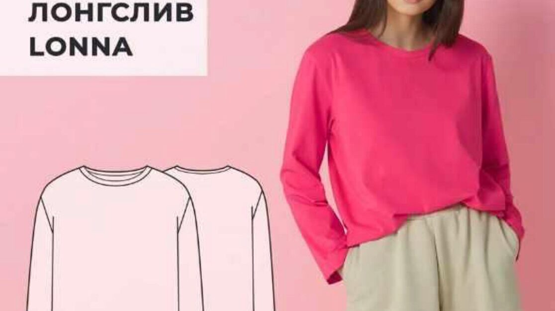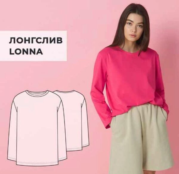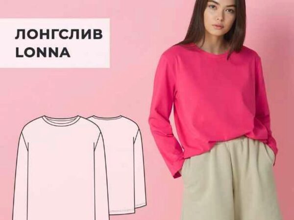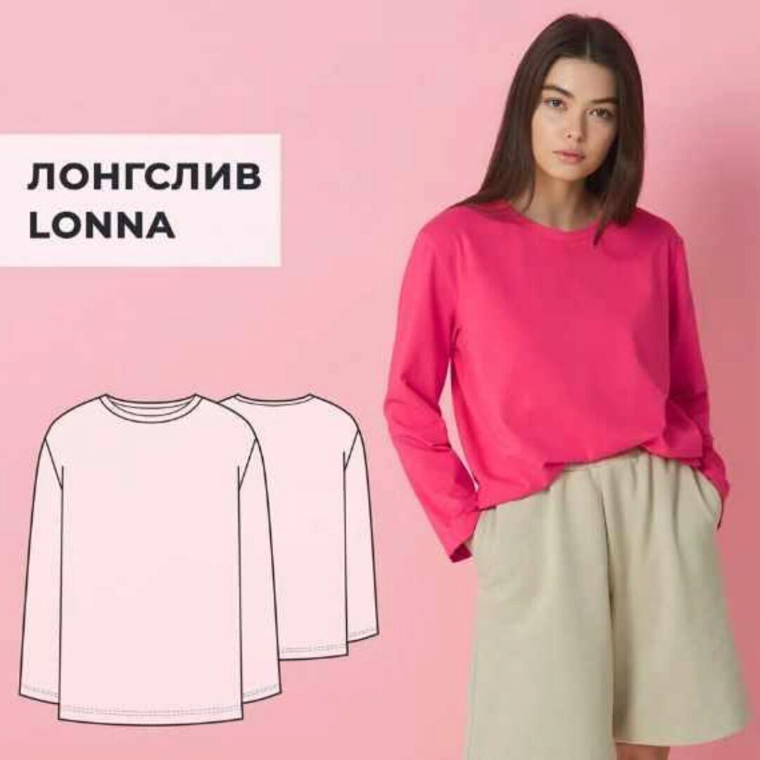 Лонгслив Lonna. Ог 80. Рост 164 УРОВЕНЬ СЛОЖНОСТИ — НАЧИНАЮЩИЙ Лонгслив свободного кроя прямого силуэта с втачным рукавом. Плечо удлинено примерно на 3 см. Горловина обработана бейкой. Низ лонгслива и низ рукавов обработаны на плоскошовной машине. Прибавки на свободу облегания –к обхвату груди 17