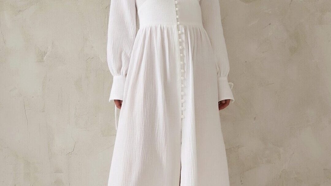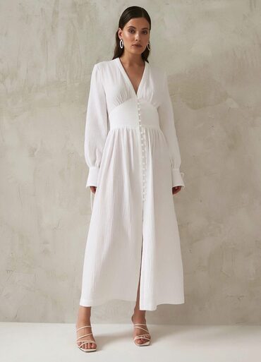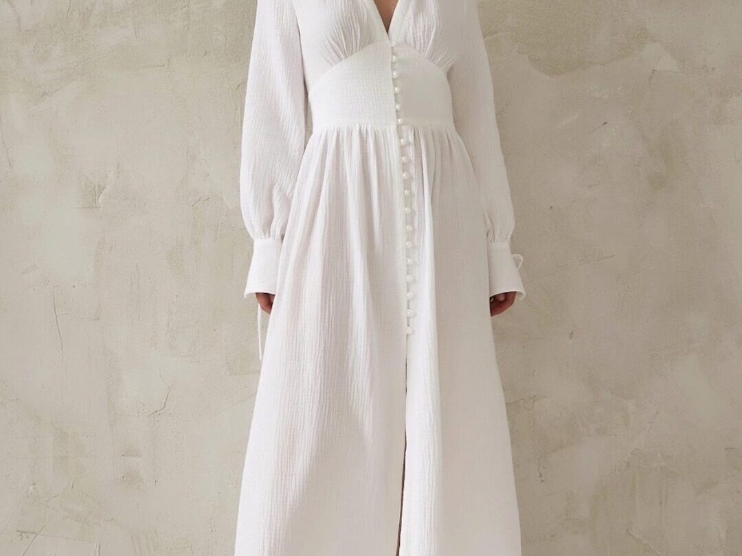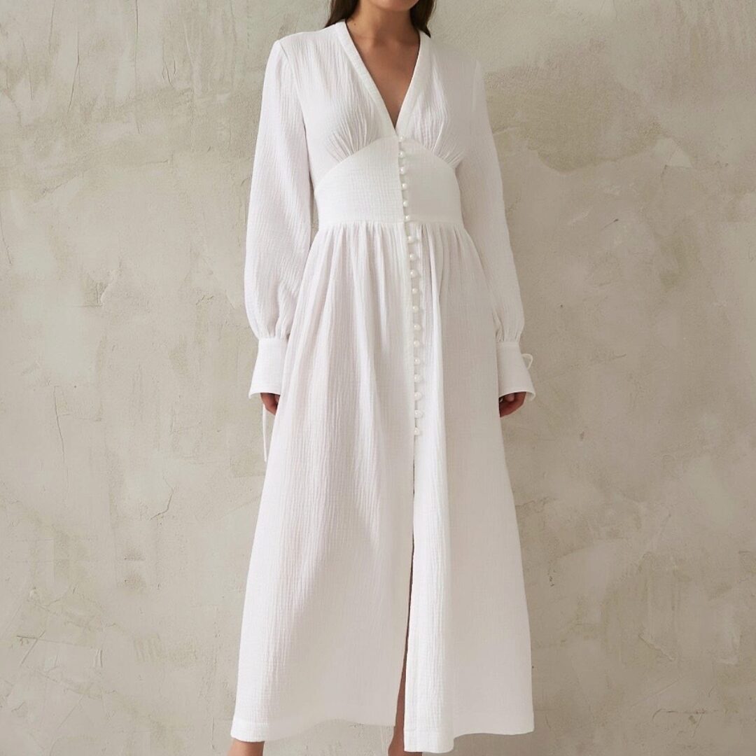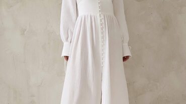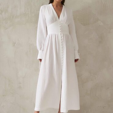 Платье сшито из отбеленного муслина, состав хлопок 100%, плотность 100 гр/м².
