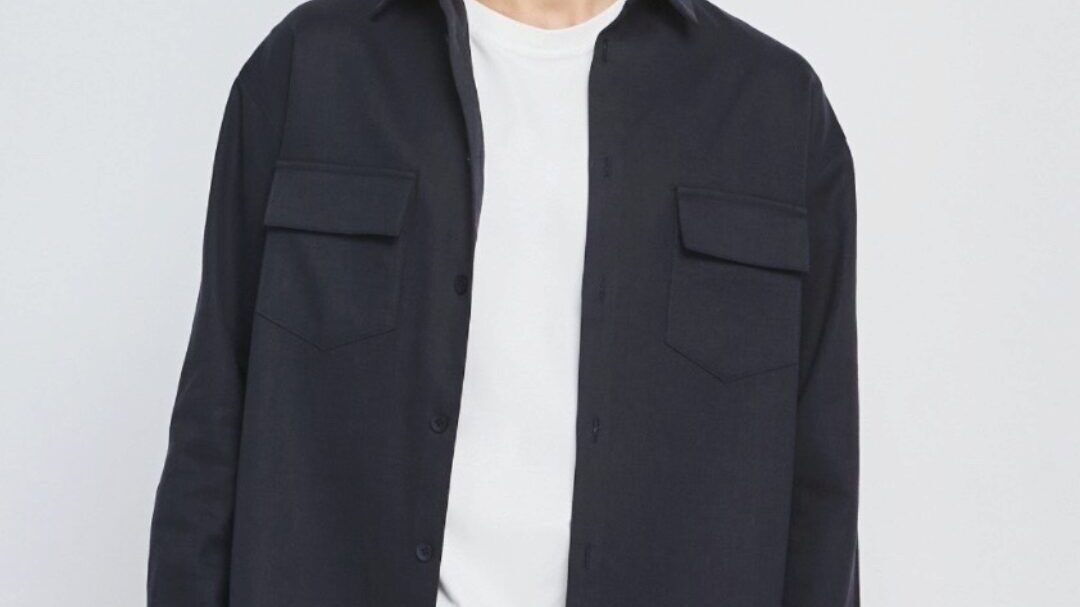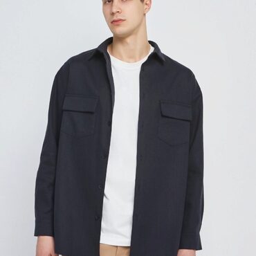 Рубашка прямого силуэта большого объема. Воротник со стойкой. По переду накладные карманы с клапанами, цельнокроенная планка, застежка на 6 пуговиц. По спинке двойная кокетка, вниз от кокетки заложены складки. Плечо спущено. Рукава с манжетами, застегивающиеся на 1 пуговицу. Рукав двухшовный со