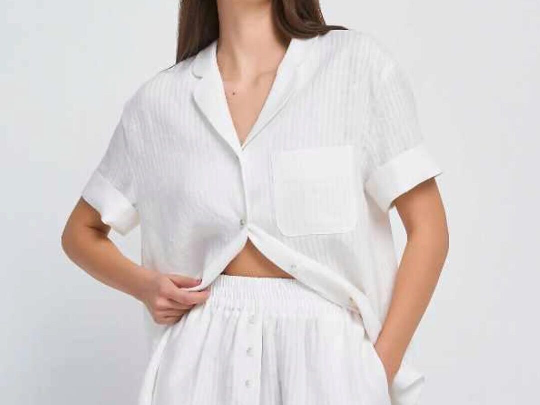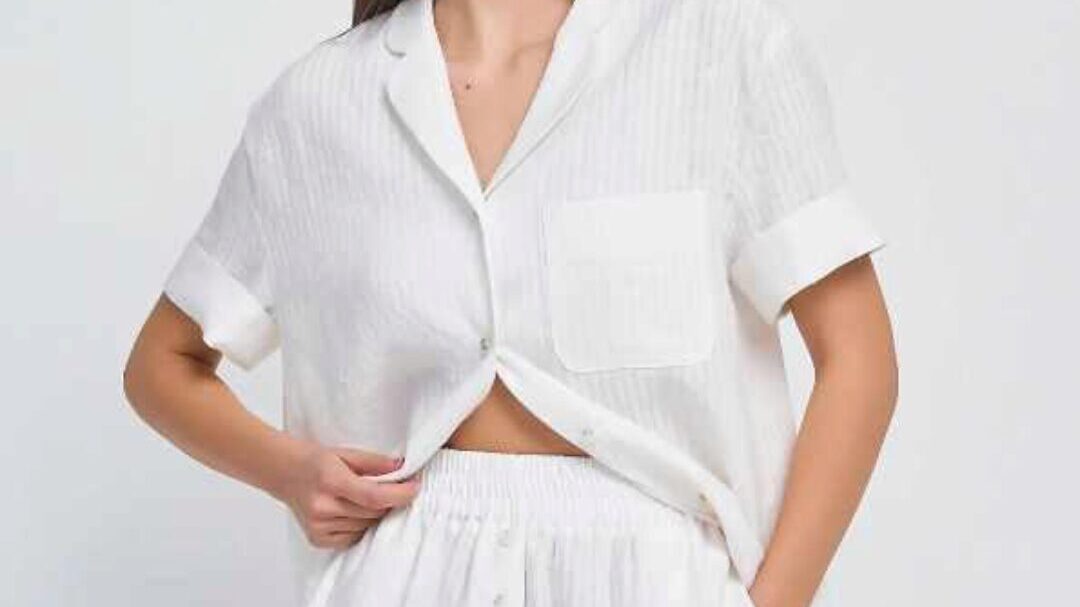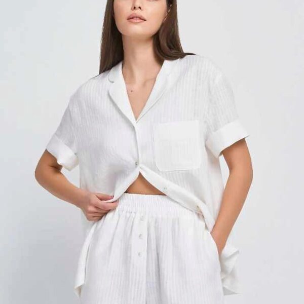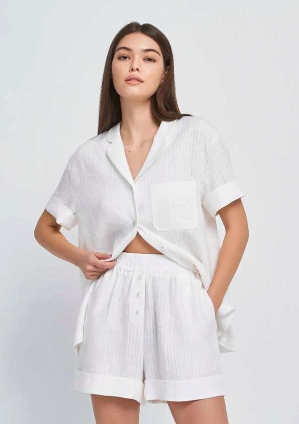 Шорты пижамные длиной до середины бедра. Пояс цельнокроенный с простроченной эластичной лентой. Высота пояса 5 см. В среднем шве передних половинок имитация гульфика с тремя пуговицами. В боковых швах карманы. По низу шорт подгибка 5 см с закрытым срезом.
